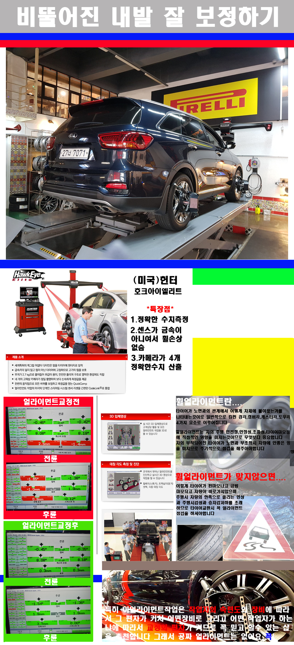 자사는 얼라이먼트정렬시 교정전 교정후를 구분하여 고객님께 직접 이수치값을 확인시켜드리고 작업을 하며 이후 각각의 특성을 가진 타이어들에 대해서 설명 및 관리요령 운전요령 같이 설명해드리고 있습니다