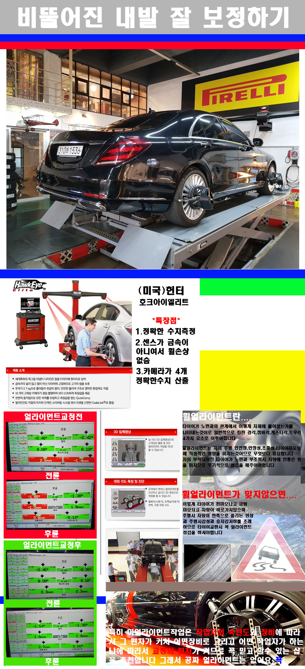 자사는 얼라이먼트정렬시 교정전 교정후를 구분하여 고객님께 직접 이수치값을 확인시켜드리고 작업을 하며 이후 각각의 특성을 가진 타이어들에 대해서 설명 및 관리요령 운전요령 같이 설명해드리고 있습니다