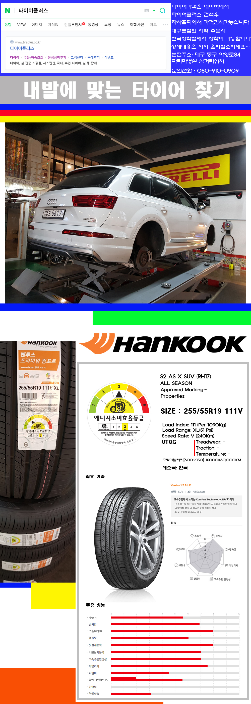 ♥♥♥본점 대구 동구 아양로84 (파티마삼거리 위치) 국산 수입타이어 할인행사중♥♥♥ 타이어플러스 대구본점은 전국에서 가장 규모가 큰매장입니다 물론 자사는 지하층 지상4층건물이며 1층작업장이외는 모두 창고로 사용중인 회사입니다 대구광역시 동구 아양로84(파티마병원 네거리에 위치) 그래서 매장으로 바로 오시면 당일에 바로 장착이 가능합니다 물론 한국 금호 넥센 브리지스톤 미쉐린 콘티넨탈 피렐리 던롭 굳이어 요코하마 등 세계유수의 10대 브랜드타이어만 취급하고 있습니다 타이어매장중 단일규모로는 아마 전국에서 제일 커지않을까 생각합니다 물론 장비도 현존하는 장비중 가장 최신장비와 그리고 유럽풍 인테리어의 최고급매장입니다 무엇하나 정품만 취급하며 작업또한 꼼꼼하게 매뉴얼에 따라서 작업을 해드립니다 특히 사장님의 이력이 화려한데 레이스로서 경험한 풍부한 자동차의 지식을 갖춘분이십니다 그래서 사장님께서 직접상담해주시고 장착도 해주시는 매장이기에 더 신뢰가 가지 않을까 생각합니다 자사는 인터넷 최저가 기반으로 성장한 회사이기에 가격또한 인터넷 최저가로 장착해 드리고 있습니다 그리고 자사는 고객만족도에서 대상까지 수상한 회사입니다 그래서 한번 저의 매장에서 작업하신 고객님은 아마 다른곳에서는 아마 눈에 차지 않을것이라 생각합니다 가격이면 가격 작업의 완성도면 완성도 그리고 사후 관리까지 최고중에 최고가 되기위해서 노력하는 매장입니다 지금까지 어느 매장에서도 느끼지 못한 감성들을 느끼시기를 바랍니다 감사합니다 요즘 SUV전용타이어 많이 시판되고 있습니다 회사별로도 무수한 패턴들이 생산이 되고있습니다 대충 타이어의 성격들을 보면 이러합니다