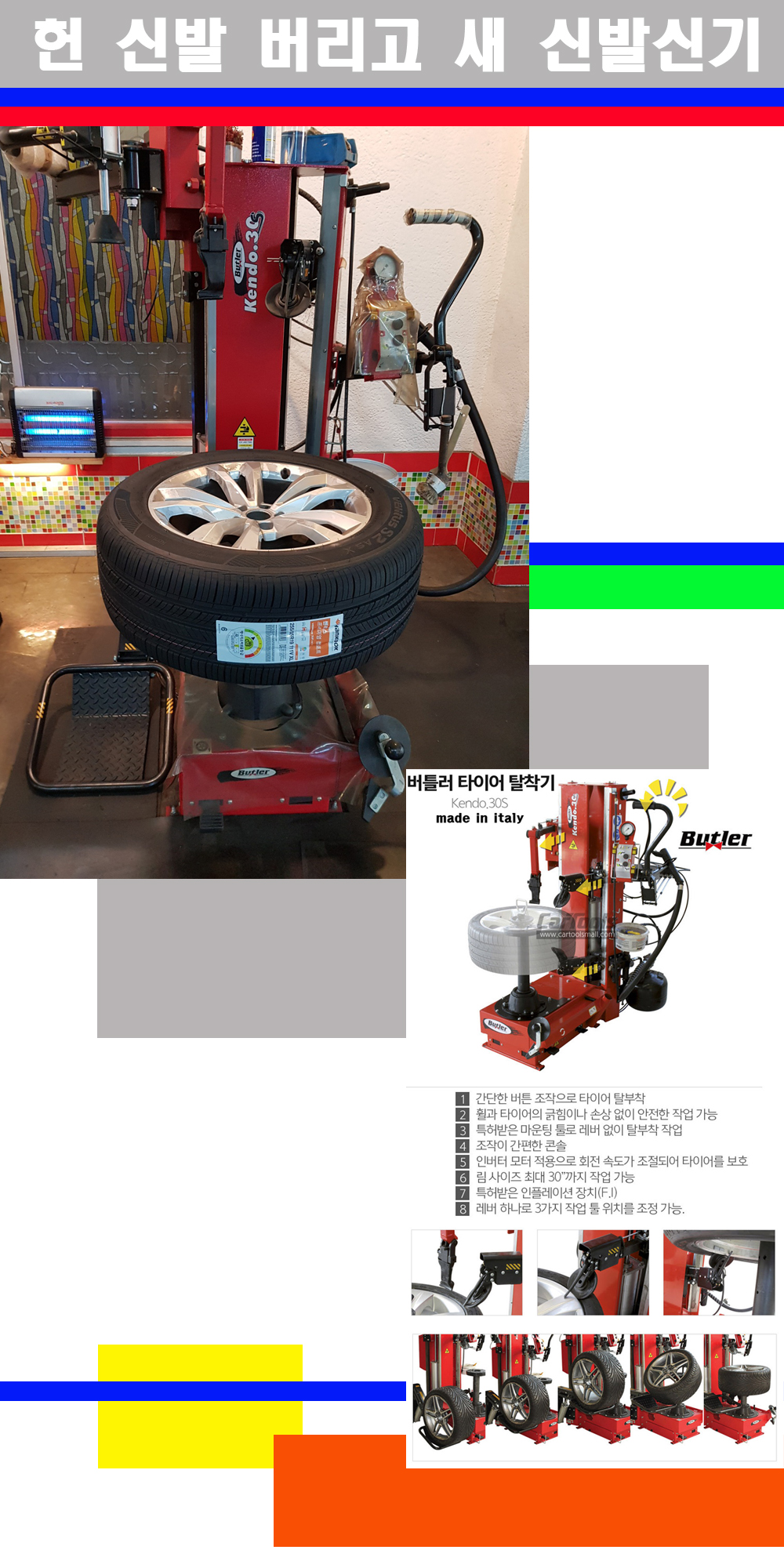 이태리 버틀러사의 켄도3.0S는 휠과 타이어와 조립과 분리시 전혀 제품에 손상을 주지않는 탈착기로 특히 센터락방식(중앙에서 휠를 고정하는 방식)이여서 휠의 중앙부위 잡아서 타이어를 탈부착하고 이후 상하롤러로 타이어를 탈부착합니다 특히 유니포미티작업(휠의 가장가벼운부분과 타이어의 가장 무거운부분을 매칭시키는 작업)시 작업자가 타이어를 정확한 지점에 휠과 매칭시킬수 있는 장점도 있습니다