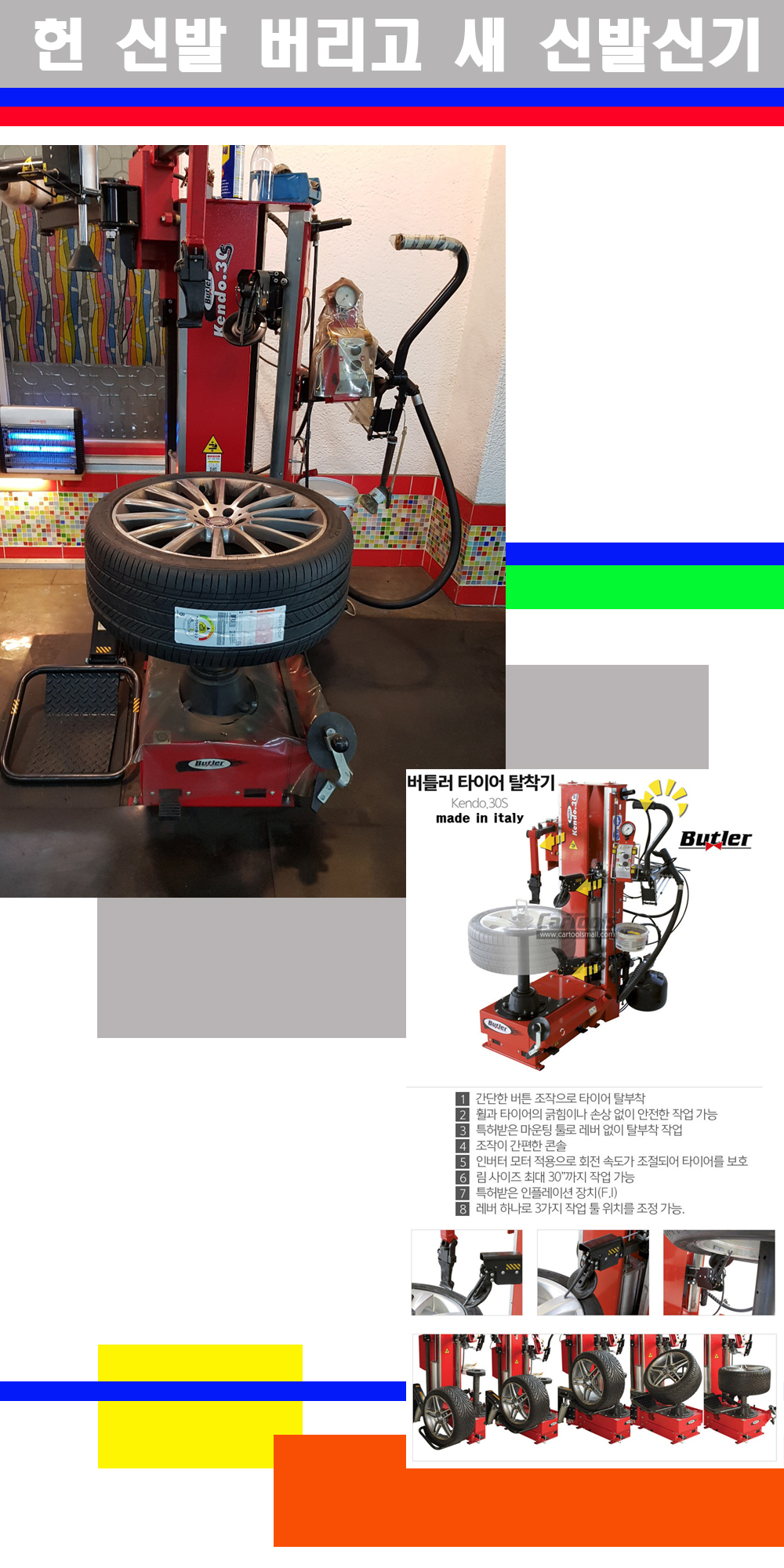 이태리 버틀러사의 켄도3.0S는 휠과 타이어와 조립과 분리시 전혀 제품에 손상을 주지않는 탈착기로 특히 센터락방식(중앙에서 휠를 고정하는 방식)이여서 휠의 중앙부위 잡아서 타이어를 탈부착하고 이후 상하롤러로 타이어를 탈부착합니다 특히 유니포미티작업(휠의 가장가벼운부분과 타이어의 가장 무거운부분을 매칭시키는 작업)시 작업자가 타이어를 정확한 지점에 휠과 매칭시킬수 있는 장점도 있습니다