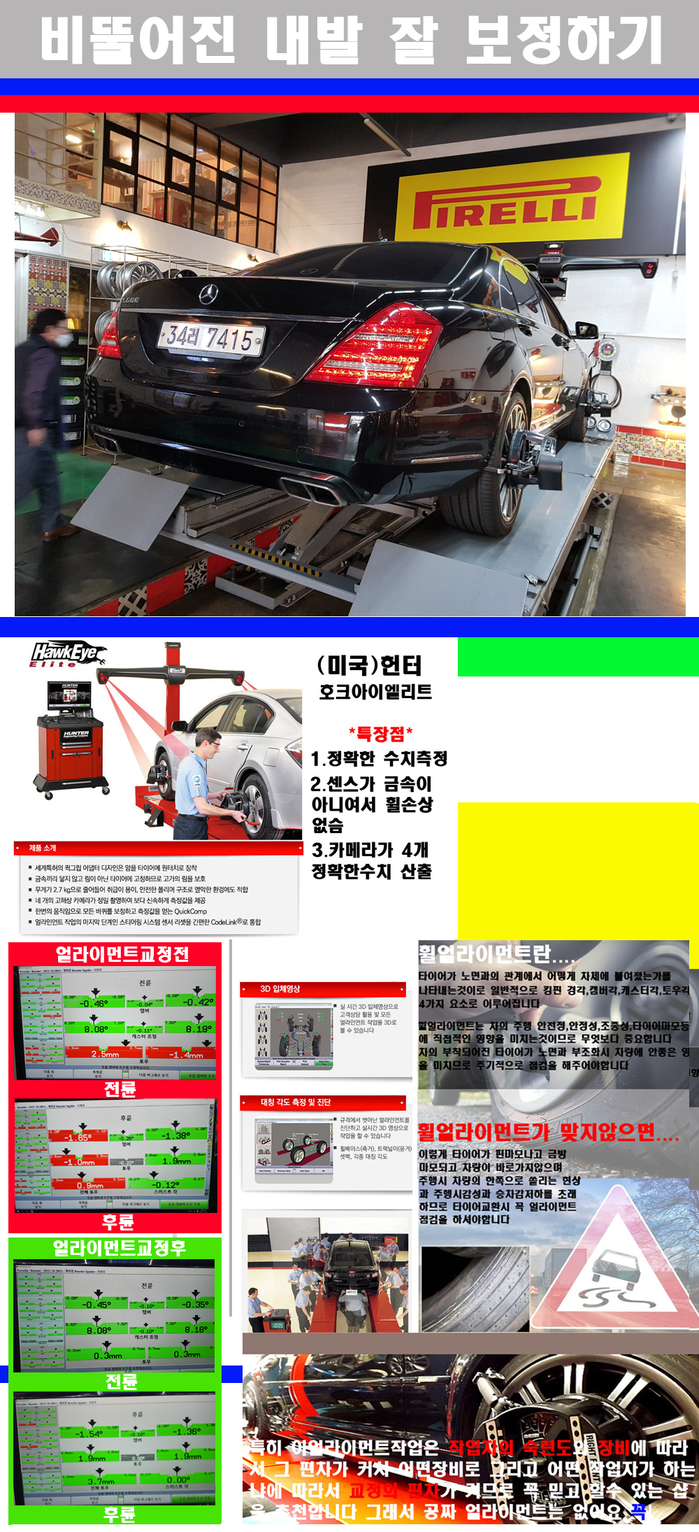 자사는 얼라이먼트정렬시 교정전 교정후를 구분하여 고객님께 직접 이수치값을 확인시켜드리고 작업을 하며 이후 각각의 특성을 가진 타이어들에 대해서 설명 및 관리요령 운전요령 같이 설명해드리고 있습니다