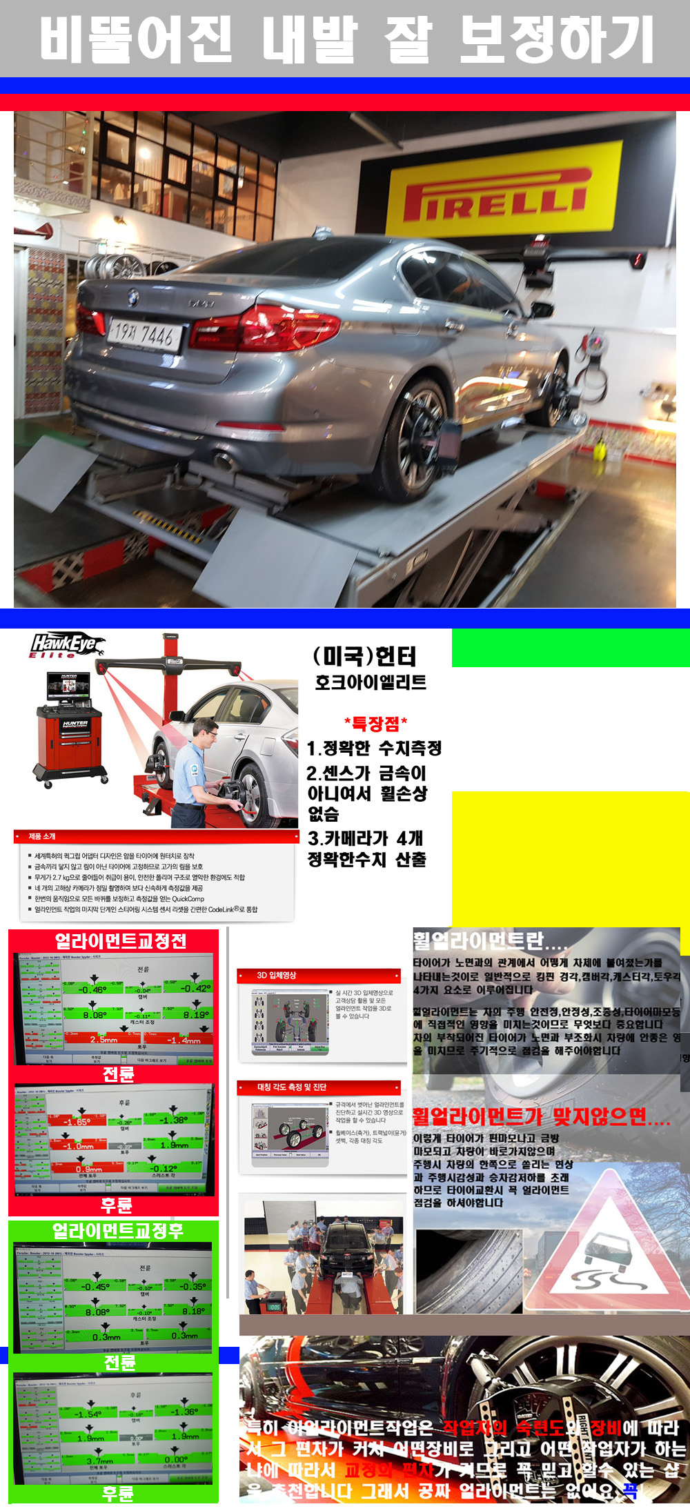 자사는 얼라이먼트정렬시 교정전 교정후를 구분하여 고객님께 직접 이수치값을 확인시켜드리고 작업을 하며 이후 각각의 특성을 가진 타이어들에 대해서 설명 및 관리요령 운전요령 같이 설명해드리고 있습니다