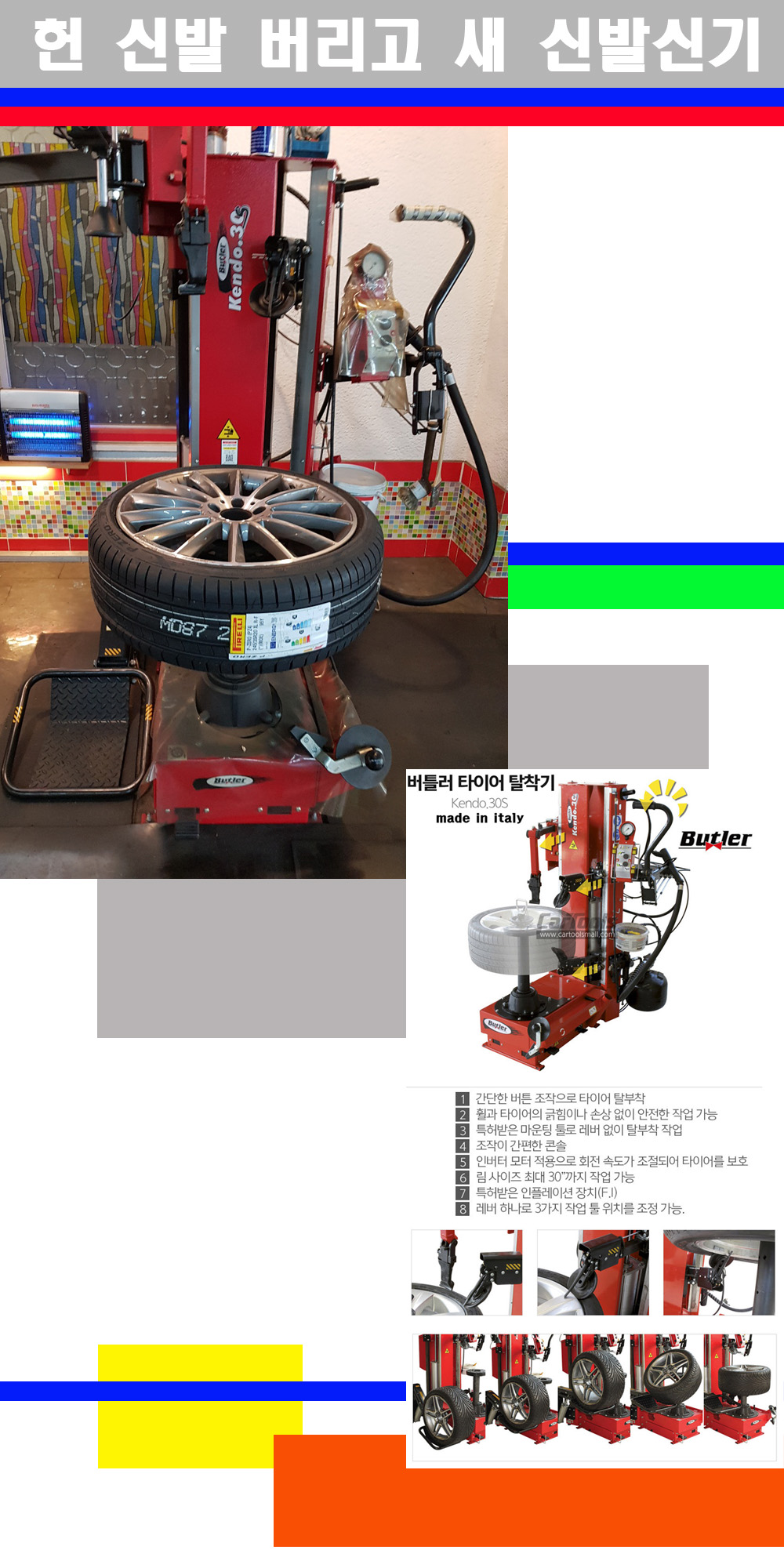 이태리 버틀러사의 켄도3.0S는 휠과 타이어와 조립과 분리시 전혀 제품에 손상을 주지않는 탈착기로 특히 센터락방식(중앙에서 휠를 고정하는 방식)이여서 휠의 중앙부위 잡아서 타이어를 탈부착하고 이후 상하롤러로 타이어를 탈부착합니다 특히 유니포미티작업(휠의 가장가벼운부분과 타이어의 가장 무거운부분을 매칭시키는 작업)시 작업자가 타이어를 정확한 지점에 휠과 매칭시킬수 있는 장점도 있습니다