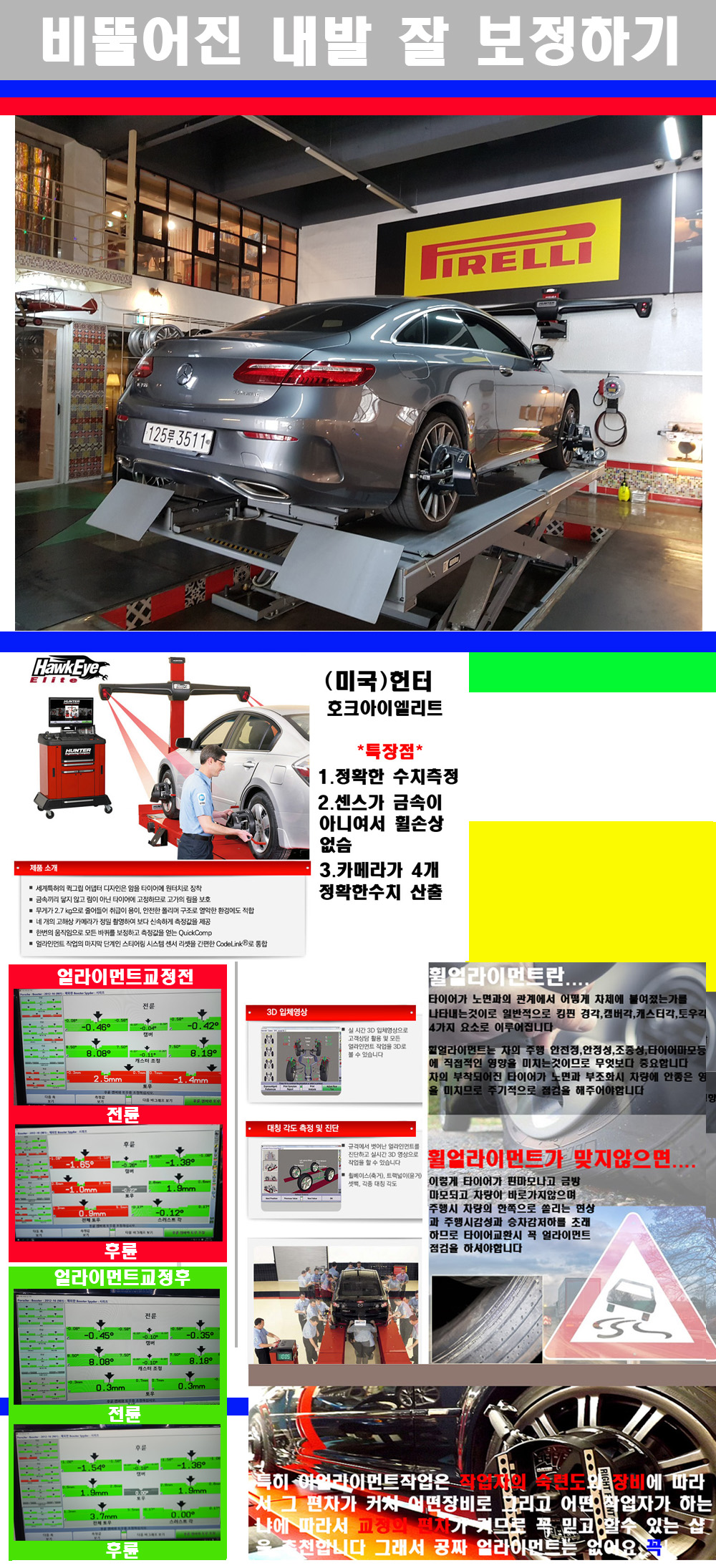 자사는 얼라이먼트정렬시 교정전 교정후를 구분하여 고객님께 직접 이수치값을 확인시켜드리고 작업을 하며 이후 각각의 특성을 가진 타이어들에 대해서 설명 및 관리요령 운전요령 같이 설명해드리고 있습니다