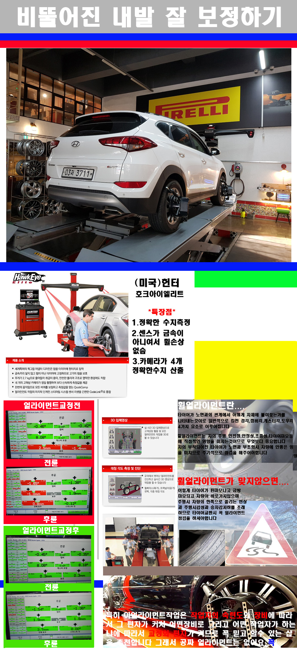 자사는 얼라이먼트정렬시 교정전 교정후를 구분하여 고객님께 직접 이수치값을 확인시켜드리고 작업을 하며 이후 각각의 특성을 가진 타이어들에 대해서 설명 및 관리요령 운전요령 같이 설명해드리고 있습니다