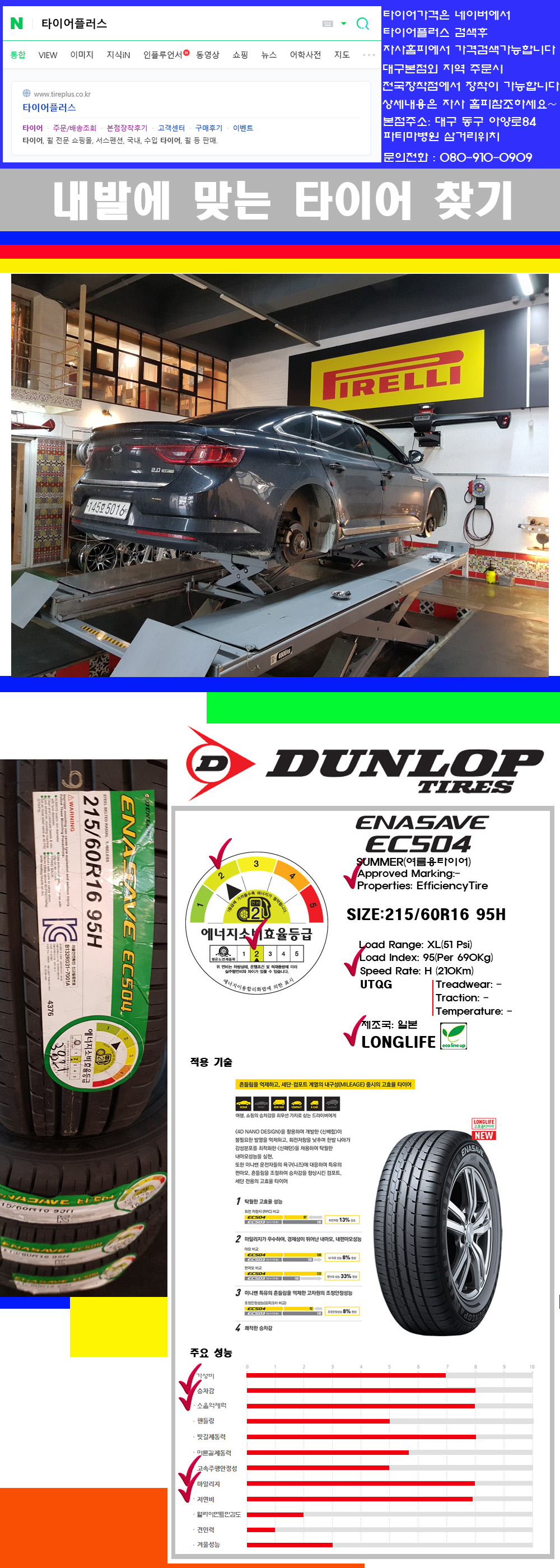 물론 한국 금호 넥센 브리지스톤 미쉐린 콘티넨탈 피렐리 던롭 굳이어 요코하마 등 세계유수의 10대 브랜드타이어만 취급하고 있습니다 타이어매장중 단일규모로는 아마 전국에서 제일 커지않을까 생각합니다 가격도 인터넷 최저가로 장착해 드리고 있습니다 고객님들이 오시면서 너무 고급스러워 가격도 비싸지 않을까 생각하시는데 네이버에서 타이어플러스사이트를 검색해보시면 가격 또한 정말 싸게 판매하고 있구나 하고 생각하실것입니다 자사홈피가격은 장착비 포함가격입니다 물론 장비도 현존하는 장비중 가장 최신장비와 그리고 유럽풍 인테리어의 최고급매장입니다 무엇하나 정품만 취급하며 작업또한 꼼꼼하게 매뉴얼에 따라서 작업을 해드립니다 특히 사장님의 이력이 화려한데 레이스로서 경험한 풍부한 자동차의 지식을 갖춘분이십니다 그래서 사장님께서 직접상담해주시고 장착도 해주시는 매장이기에 더 신뢰가 가지 않을까 생각합니다 자사는 인터넷 최저가 기반으로 성장한 회사이기에 가격또한 인터넷 최저가로 장착해 드리고 있습니다 그리고 자사는 고객만족도에서 대상까지 수상한 회사입니다 그래서 한번 저의 매장에서 작업하신 고객님은 아마 다른곳에서는 아마 눈에 차지 않을것이라 생각합니다 가격이면 가격 작업의 완성도면 완성도 그리고 사후 관리까지 최고중에 최고가 되기위해서 노력하는 매장입니다 지금까지 어느 매장에서도 느끼지 못한 감성들을 느끼시기를 바랍니다 감사합니다 던롭타이어에 대해서 조금 생소하시죠!! 이타이어회사는 영국에 본사를 두고있는 전세계 시장점유률 7위정도하는 회사입니다 물론 지금은 전세계에서 생산하는 다국적 기업입니다 현재는 일본등지에서 OE방식으로 많이 생산되고 있습니다 이던롭타이어는 처음 고무로된 타이어는 완충작용을 하지못해서 던롭이라는 개발자의 아들이 자전거를 타고 가다가 많이 다쳐서 안락하고 승차감있는 타이어를 만들기 위해서 공기를 주입하는 튜브식 타이어를 만든 사람이 던롭입니다 물론 이분은 의사입니다 그래서 그런지 여러 사용상의 필요에 의해서 많이 관철하고 어떤 타이어가 좋은지에 대해서 연구를 많이 해서 만들어진 타이어가 최초의 공기 충전식 타이어이며 그후 대량생산하게 된 회사가 던롭타이어입니다 물론 이회사는 일본차종 및 독일차종에 순정품으로 장착이 되는 타이어이며 순정품이후 대체시장용(RE)으로 현재는 LM704 EC504 EC204등 여러가지 패턴들이 공급되고 있습니다 전반적으로 RE용타이어들을 보면 에너지 효율이 높고 배수성능이 좋은 여름용타이어를 주력으로 공급하고 있습니다 일본에서 생산되는 던롭타이어들의 특성들은 승차감이 좋고 소음억제력이 좋다입니다 그리고 시장에 공략하는 가격도 착해서 한번쯤 장착을 권장하고 싶은 제품들입니다 참고로 타이어의 본래의 특성을 지닌 타이어는 여름용타이어입니다 부드러워서 승차감이 좋고 커프와 사이프와 핀수가 적어 소음억제력이 좋으며 잘서고 잘달리며 잘돕니다 하지만 수명이 4계절용타이어에 비해서 20~30%정도 짧으며 결빙된 노면에서 제동거리가 조금 더길다는 단점이 있습니다 그렇다고 겨울에 여름용타이어를 사용하지 말라는 것은 아닙니다 영상7도씨 밑에서의 타이어 딱딱해지는 경화성은 4계절용타이어나 여름용타이어 모두 가지는 단점이기에 겨울철에는 겨울용타이어를 장착하시는 것이 가장좋은 방법입니다 이제품은 비오는날 제동거리가 4계절용타이어보다 30%정도 짧으며 특히 마른길 노면에서의 제동거리가 20~33%정도 짧아지며 소음억제력과 승차감구현력이 좋아 한국정서에 잘맞는 제품입니다 한번쯤 장착을 권장해드립니다 찾아주셔서 감사합니다