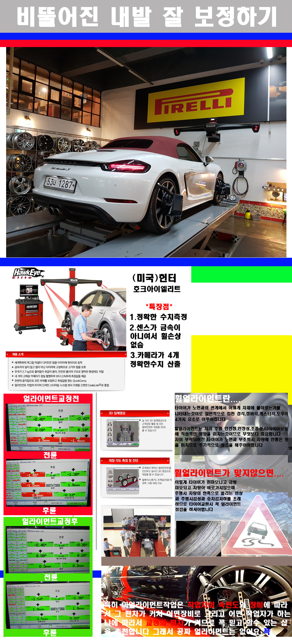 자사는 얼라이먼트정렬시 교정전 교정후를 구분하여 고객님께 직접 이수치값을 확인시켜드리고 작업을 하며 이후 각각의 특성을 가진 타이어들에 대해서 설명 및 관리요령 운전요령 같이 설명해드리고 있습니다