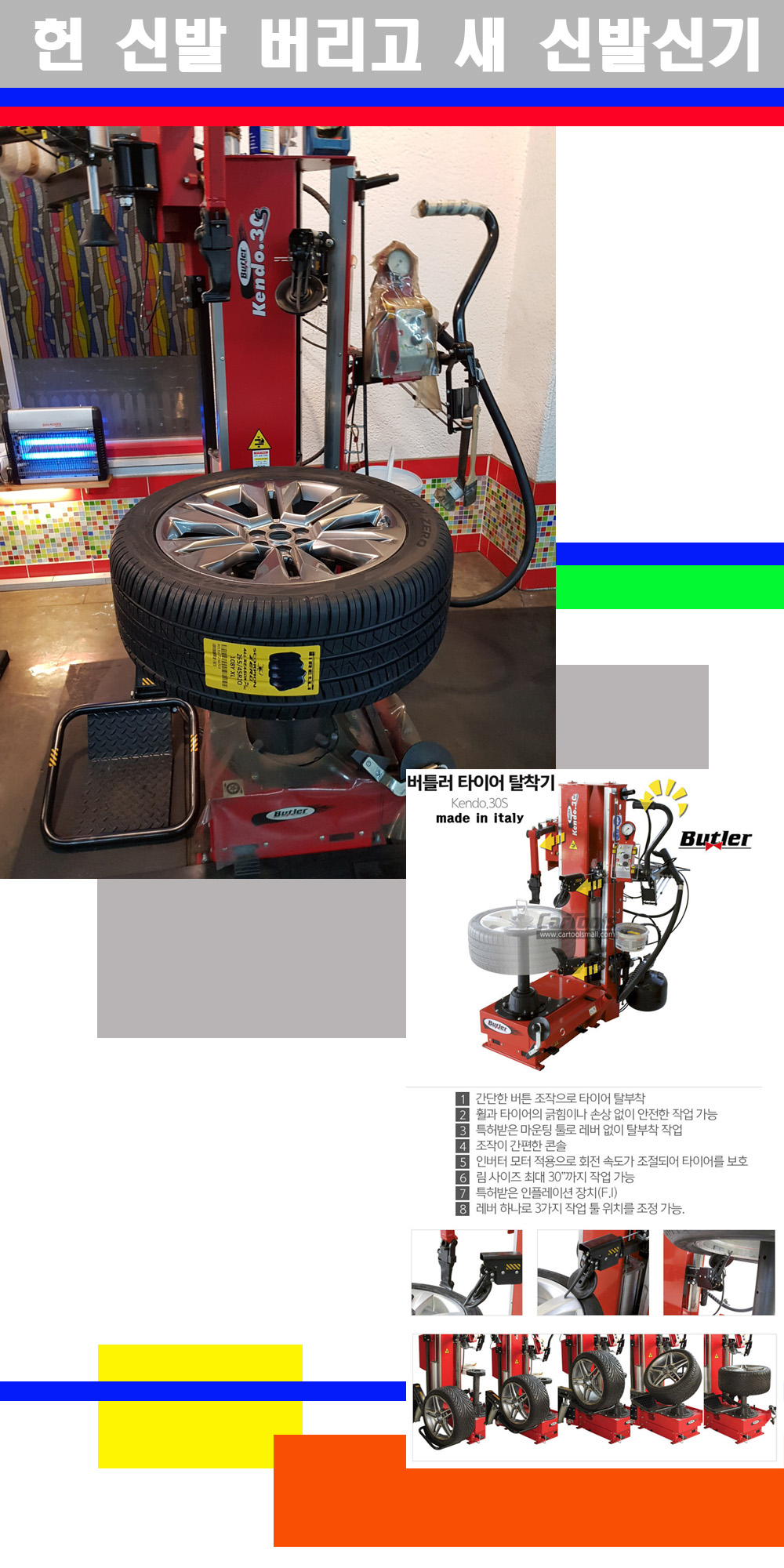 이태리 버틀러사의 켄도3.0S는 휠과 타이어와 조립과 분리시 전혀 제품에 손상을 주지않는 탈착기로 특히 센터락방식(중앙에서 휠를 고정하는 방식)이여서 휠의 중앙부위 잡아서 타이어를 탈부착하고 이후 상하롤러로 타이어를 탈부착합니다 특히 유니포미티작업(휠의 가장가벼운부분과 타이어의 가장 무거운부분을 매칭시키는 작업)시 작업자가 타이어를 정확한 지점에 휠과 매칭시킬수 있는 장점도 있습니다