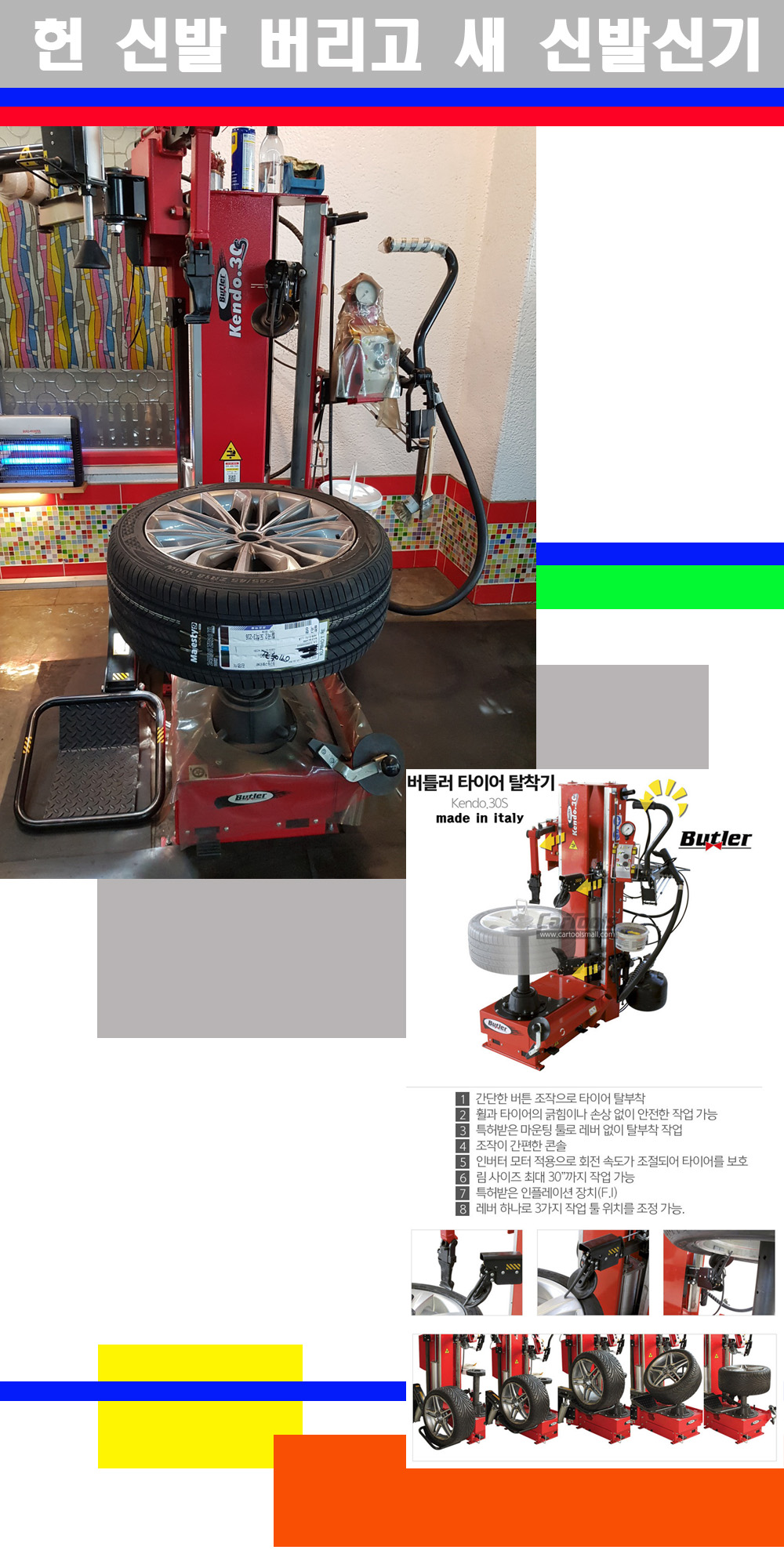 이태리 버틀러사의 켄도3.0S는 휠과 타이어와 조립과 분리시 전혀 제품에 손상을 주지않는 탈착기로 특히 센터락방식이여서 휠의 중앙부위 잡아서 타이어를 탈부착하고 이후 상하롤러로 타이어를 탈부착합니다 특히 유니포미티작업(휠의 가장가벼운부분과 타이어의 가장 무거운부분을 매칭시키는 작업)시 작업자가 타이어를 정확한 지점에 휠과 매칭시킬수 있는 장점도 있습니다