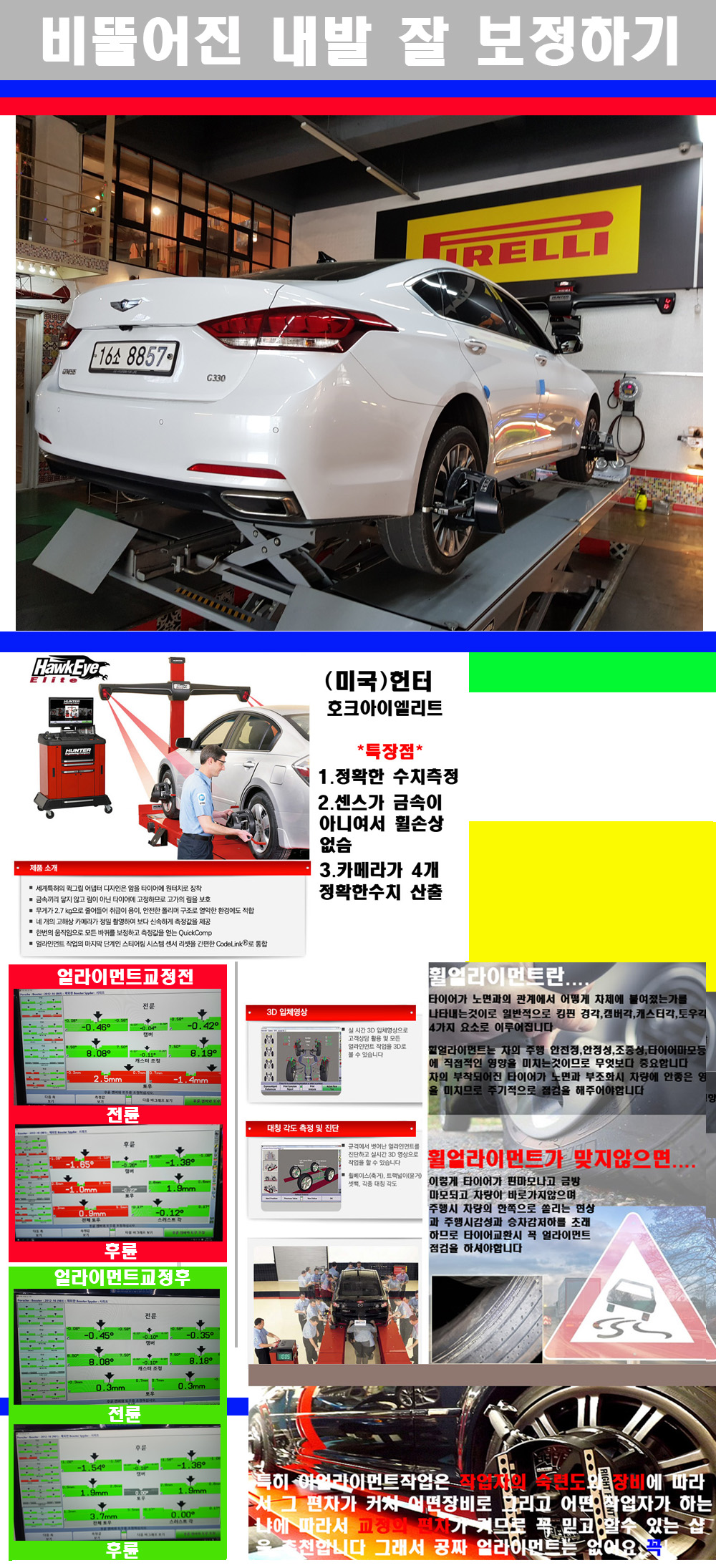 자사는 얼라이먼트정렬시 교정전 교정후를 구분하여 고객님께 직접 이수치값을 확인시켜드리고 작업을 하며 이후 각각의 특성을 가진 타이어들에 대해서 설명 및 관리요령 운전요령 같이 설명해드리고 있습니다