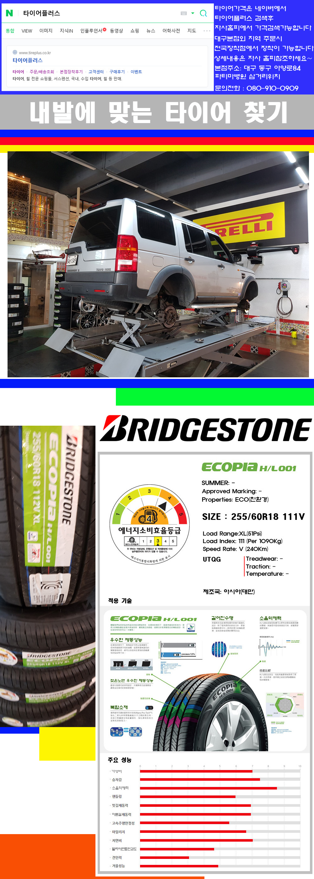 ♥♥♥본점 대구 동구 아양로84 (파티마삼거리 위치) 국산 수입타이어 할인행사중♥♥♥ 타이어플러스 대구본점은 전국에서 가장 규모가 큰매장입니다 물론 자사는 지하층 지상4층건물이며 1층작업장이외는 모두 창고로 사용중인 회사입니다 대구광역시 동구 아양로84(파티마병원 네거리에 위치)그래서 매장으로 바로 오시면 당일에 바로 장착이 가능합니다 물론 한국 금호 넥센 브리지스톤 미쉐린 콘티넨탈 피렐리 던롭 굳이어 요코하마 등 세계유수의 10대 브랜드타이어만 취급하고 있습니다 타이어매장중 단일규모로는 아마 전국에서 제일 커지않을까 생각합니다 물론 장비도 현존하는 장비중 가장 최신장비와 그리고 유럽풍 인테리어의 최고급매장입니다 무엇하나 정품만 취급하며 작업또한 꼼꼼하게 매뉴얼에 따라서 작업을 해드립니다 특히 사장님의 이력이 화려한데 레이스로서 경험한 풍부한 자동차의 지식을 갖춘분이십니다 그래서 사장님께서 직접상담해주시고 장착도 해주시는 매장이기에 더 신뢰가 가지 않을까 생각합니다 자사는 인터넷 최저가 기반으로 성장한 회사이기에 가격또한 인터넷 최저가로 장착해 드리고 있습니다 그리고 자사는 고객만족도에서 대상까지 수상한 회사입니다 그래서 한번 저의 매장에서 작업하신 고객님은 아마 다른곳에서는 아마 눈에 차지 않을것이라 생각합니다 가격이면 가격 작업의 완성도면 완성도 그리고 사후 관리까지 최고중에 최고가 되기위해서 노력하는 매장입니다 지금까지 어느 매장에서도 느끼지 못한 감성들을 느끼시기를 바랍니다 감사합니다 브리지스톤타이어 에코피아 HL001 235/55R19 이제품은 이전 EP850후속모델입니다 이전보다 마일리지와 접지력을 향상시킨제품으로 4계절용타이어로 사용하셔도 무관한 제품입니다 사실 친환경타이어여서 분류상 여름용타이어로 분류하지만 충분하게 핀수와 사이프수를 가지고 있어 빙판길에서도 충분한 제동성능을 가진 제품입니다 무엇보다 소음억제력이 시중에 나와있는 타이어중 가장 우수하여 소음에 민간한 고객님께 추천해드리고 싶은 제품입니다 참고로 브리지스톤타이어는 전세계에서 타이어판매본수로 10년간 1위를 항상 유지하는 회사입니다 품질면에서 그리고 타이어성능면에서 볼때 조용하고 조용한 타이어를 원하시구 승차감를 원하시는 고객님에게 정말 강추해드립니다 고객님 찾아주셔서 감사합니다