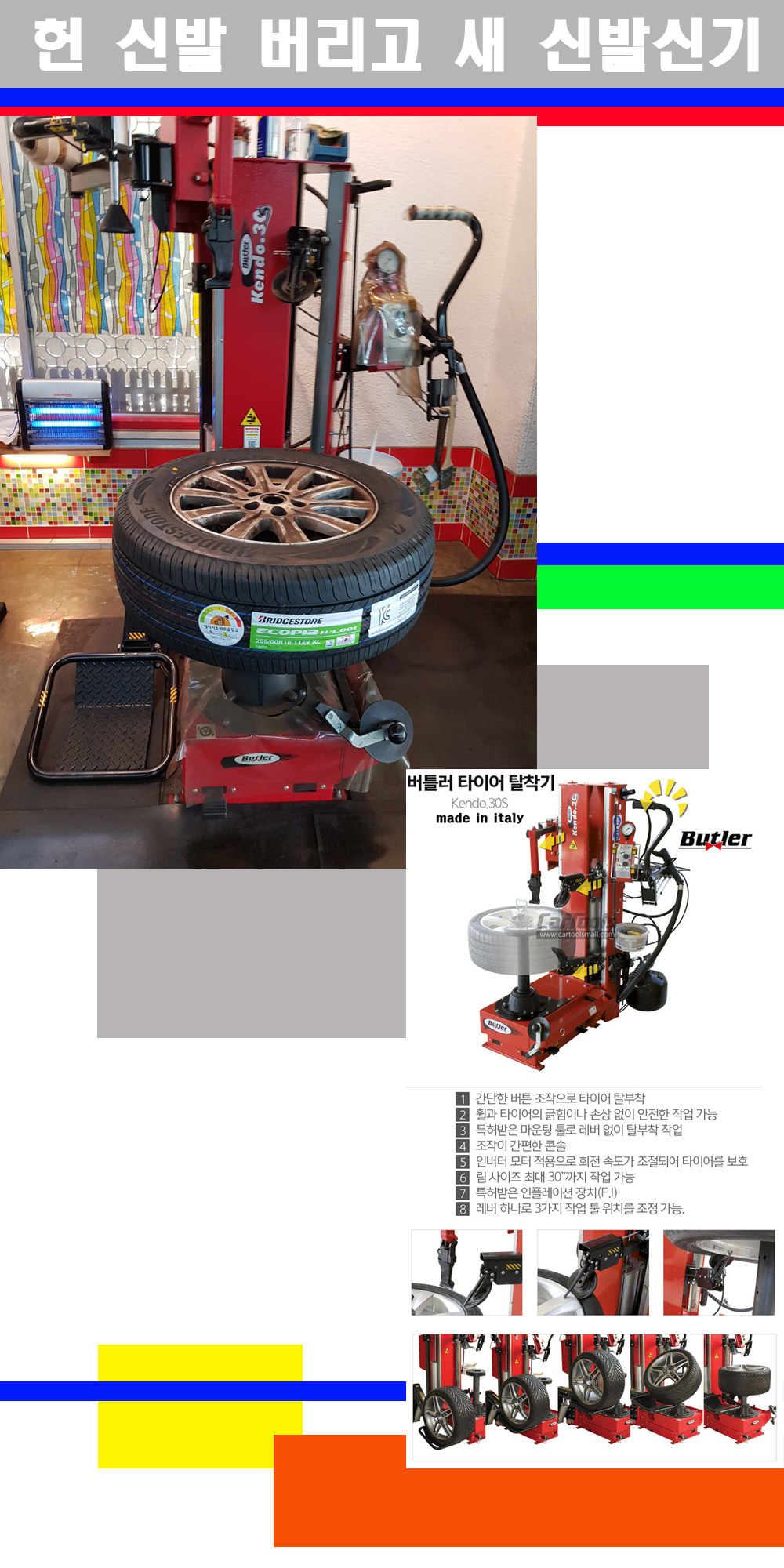 이태리 버틀러사의 켄도3.0S는 휠과 타이어와 조립과 분리시 전혀 제품에 손상을 주지않는 탈착기로 특히 센터락방식(중앙에서 휠를 고정하는 방식)이여서 휠의 중앙부위 잡아서 타이어를 탈부착하고 이후 상하롤러로 타이어를 탈부착합니다 특히 유니포미티작업(휠의 가장가벼운부분과 타이어의 가장 무거운부분을 매칭시키는 작업)시 작업자가 타이어를 정확한 지점에 휠과 매칭시킬수 있는 장점도 있습니다