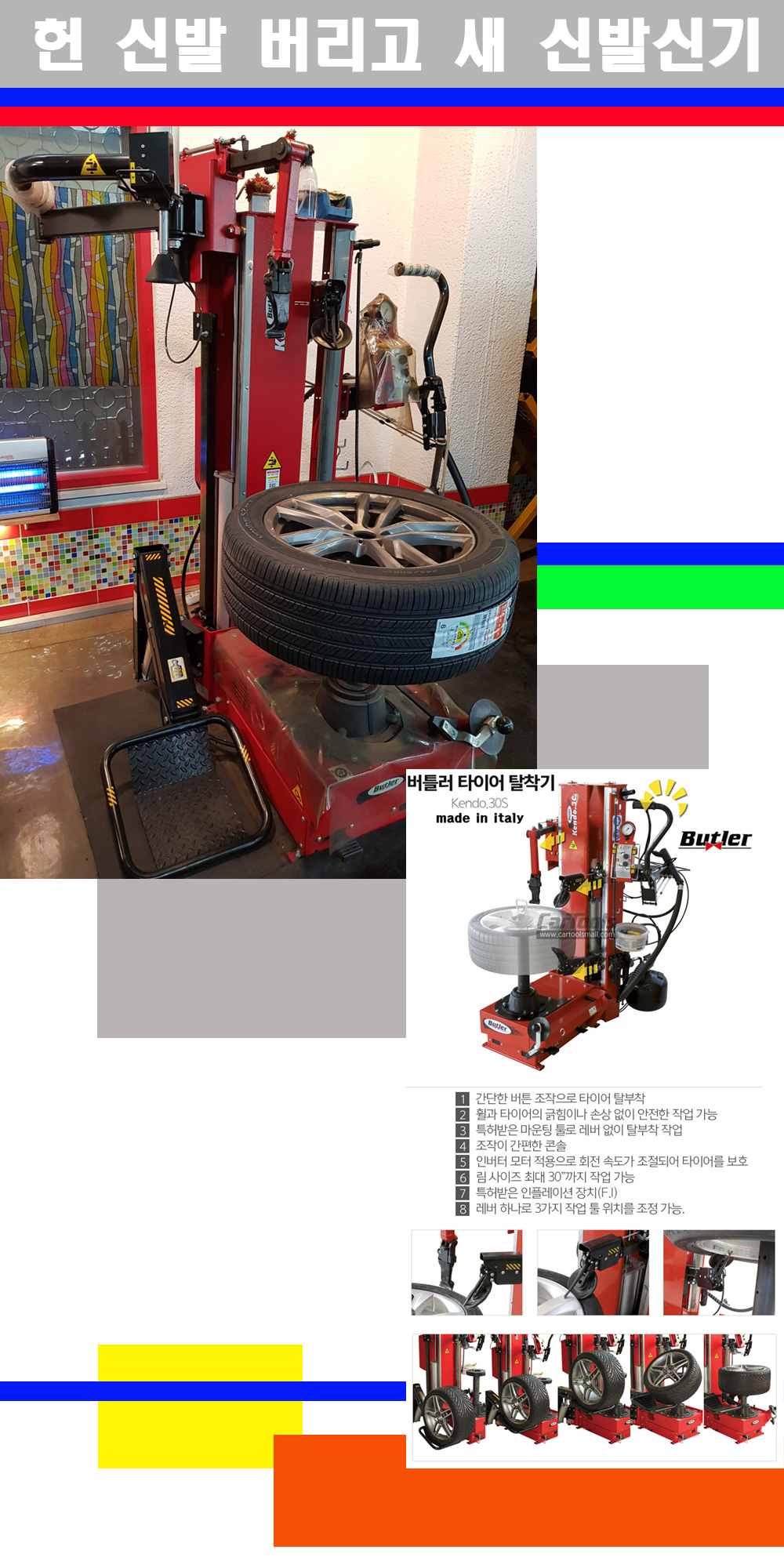 이태리 버틀러사의 켄도3.0S는 휠과 타이어와 조립과 분리시 전혀 제품에 손상을 주지않는 탈착기로 특히 센터락방식(중앙에서 휠를 고정하는 방식)이여서 휠의 중앙부위 잡아서 타이어를 탈부착하고 이후 상하롤러로 타이어를 탈부착합니다 특히 유니포미티작업(휠의 가장가벼운부분과 타이어의 가장 무거운부분을 매칭시키는 작업)시 작업자가 타이어를 정확한 지점에 휠과 매칭시킬수 있는 장점도 있습니다
