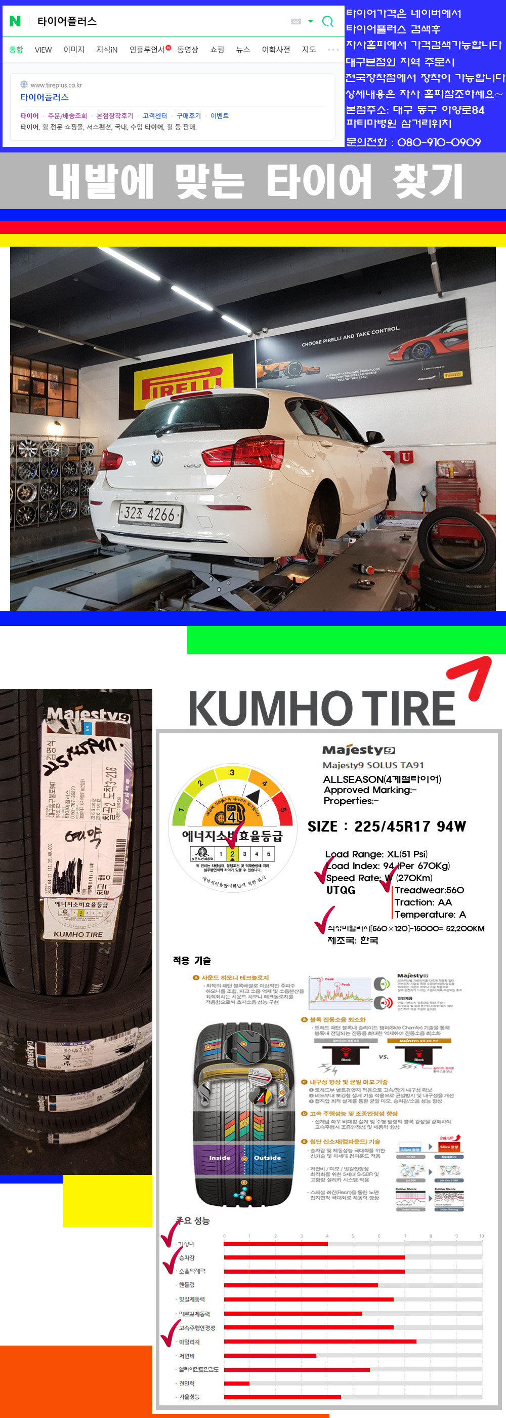 물론 한국 금호 넥센 브리지스톤 미쉐린 콘티넨탈 피렐리 던롭 굳이어 요코하마 등 세계유수의 10대 브랜드타이어만 취급하고 있습니다 타이어매장중 단일규모로는 아마 전국에서 제일 커지않을까 생각합니다 가격도 인터넷 최저가로 장착해 드리고 있습니다 고객님들이 오시면서 너무 고급스러워 가격도 비싸지 않을까 생각하시는데 네이버에서 타이어플러스사이트를 검색해보시면 가격 또한 정말 싸게 판매하고 있구나 하고 생각하실것입니다 자사홈피가격은 장착비 포함가격입니다 물론 장비도 현존하는 장비중 가장 최신장비와 그리고 유럽풍 인테리어의 최고급매장입니다 무엇하나 정품만 취급하며 작업또한 꼼꼼하게 매뉴얼에 따라서 작업을 해드립니다 특히 사장님의 이력이 화려한데 레이스로서 경험한 풍부한 자동차의 지식을 갖춘분이십니다 그래서 사장님께서 직접상담해주시고 장착도 해주시는 매장이기에 더 신뢰가 가지 않을까 생각합니다 자사는 인터넷 최저가 기반으로 성장한 회사이기에 가격또한 인터넷 최저가로 장착해 드리고 있습니다 그리고 자사는 고객만족도에서 대상까지 수상한 회사입니다 그래서 한번 저의 매장에서 작업하신 고객님은 아마 다른곳에서는 아마 눈에 차지 않을것이라 생각합니다 가격이면 가격 작업의 완성도면 완성도 그리고 사후 관리까지 최고중에 최고가 되기위해서 노력하는 매장입니다 지금까지 어느 매장에서도 느끼지 못한 감성들을 느끼시기를 바랍니다 감사합니다 타이어플러스 대구본점은 전국에서 가장 규모가 큰매장입니다 물론 자사는 지하층 지상4층건물이며 1층작업장이외는 모두 창고로 사용중인 회사입니다 대구광역시 동구 아양로84(파티마병원 네거리에 위치) 그래서 매장으로 바로 오시면 당일에 바로 장착이 가능합니다 물론 한국 금호 넥센 브리지스톤 미쉐린 콘티넨탈 피렐리 던롭 굳이어 요코하마 등 세계유수의 10대 브랜드타이어만 취급하고 있습니다 타이어매장중 단일규모로는 아마 전국에서 제일 커지않을까 생각합니다 물론 장비도 현존하는 장비중 가장 최신장비와 그리고 유럽풍 인테리어의 최고급매장입니다 무엇하나 정품만 취급하며 작업또한 꼼꼼하게 매뉴얼에 따라서 작업을 해드립니다 특히 사장님의 이력이 화려한데 레이스로서 경험한 풍부한 자동차의 지식을 갖춘분이십니다 그래서 사장님께서 직접상담해주시고 장착도 해주시는 매장이기에 더 신뢰가 가지 않을까 생각합니다 자사는 인터넷 최저가 기반으로 성장한 회사이기에 가격또한 인터넷 최저가로 장착해 드리고 있습니다 그리고 자사는 고객만족도에서 대상까지 수상한 회사입니다 그래서 한번 저의 매장에서 작업하신 고객님은 아마 다른곳에서는 아마 눈에 차지 않을것이라 생각합니다 가격이면 가격 작업의 완성도면 완성도 그리고 사후 관리까지 최고중에 최고가 되기위해서 노력하는 매장입니다 지금까지 어느 매장에서도 느끼지 못한 감성들을 느끼시기를 바랍니다 감사합니다 현재 프리미엄 내수시장은 현재 한국타이어 S2AS 금호타이어 마제스티9 넥센타이어 슈프림 이렇게 공급되어 지고 있습니다 이제품들을 설명하기전에 이전에 공급되어지는 제품들에 대해서 설명하고 위의 제품들에 대해서 설명하겠습니다