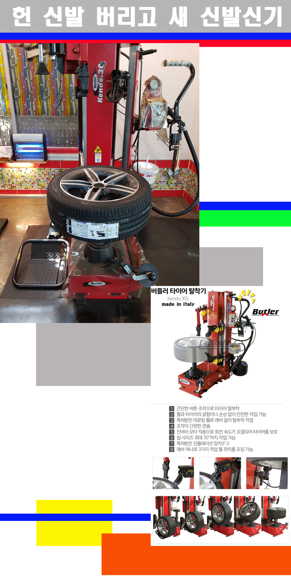 이태리 버틀러사의 켄도3.0S는 휠과 타이어와 조립과 분리시 전혀 제품에 손상을 주지않는 탈착기로 특히 센터락방식이여서 휠의 중앙부위 잡아서 타이어를 탈부착하고 이후 상하롤러로 타이어를 탈부착합니다 특히 유니포미티작업(휠의 가장가벼운부분과 타이어의 가장 무거운부분을 매칭시키는 작업)시 작업자가 타이어를 정확한 지점에 휠과 매칭시킬수 있는 장점도 있습니다