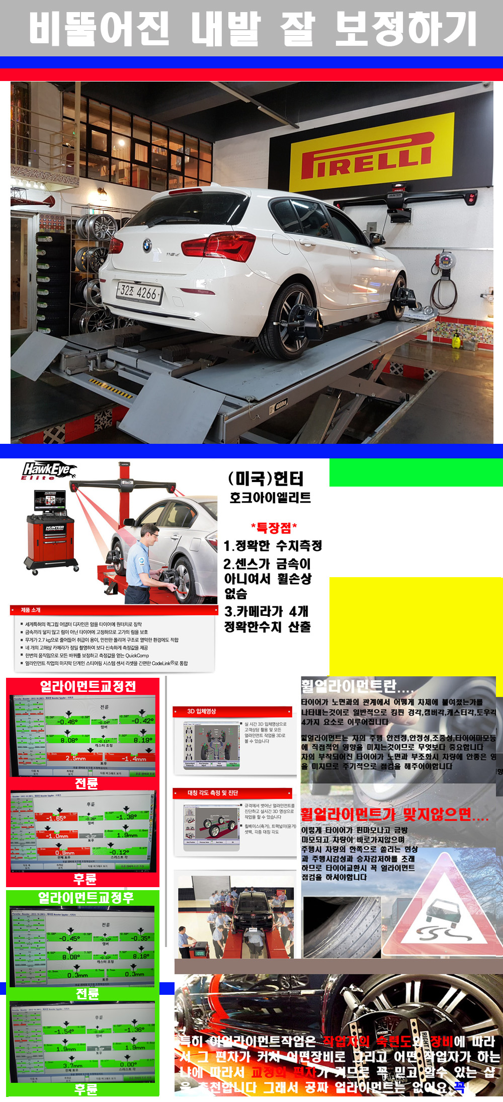 자사는 얼라이먼트정렬시 교정전 교정후를 구분하여 고객님께 직접 이수치값을 확인시켜드리고 작업을 하며 이후 각각의 특성을 가진 타이어들에 대해서 설명 및 관리요령 운전요령 같이 설명해드리고 있습니다