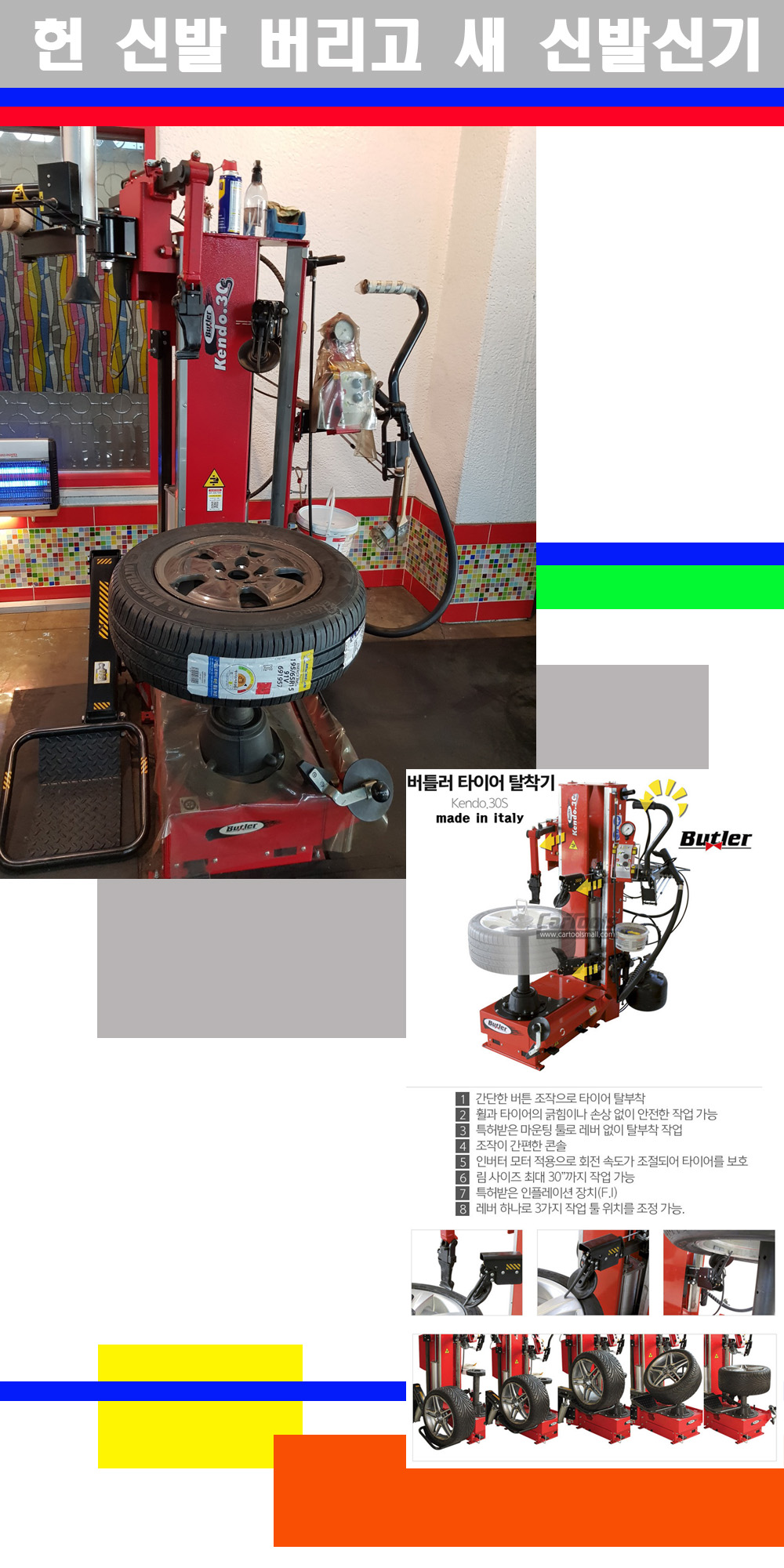 이태리 버틀러사의 켄도3.0S는 휠과 타이어와 조립과 분리시 전혀 제품에 손상을 주지않는 탈착기로 특히 센터락방식이여서 휠의 중앙부위 잡아서 타이어를 탈부착하고 이후 상하롤러로 타이어를 탈부착합니다 특히 유니포미티작업(휠의 가장가벼운부분과 타이어의 가장 무거운부분을 매칭시키는 작업)시 작업자가 타이어를 정확한 지점에 휠과 매칭시킬수 있는 장점도 있습니다