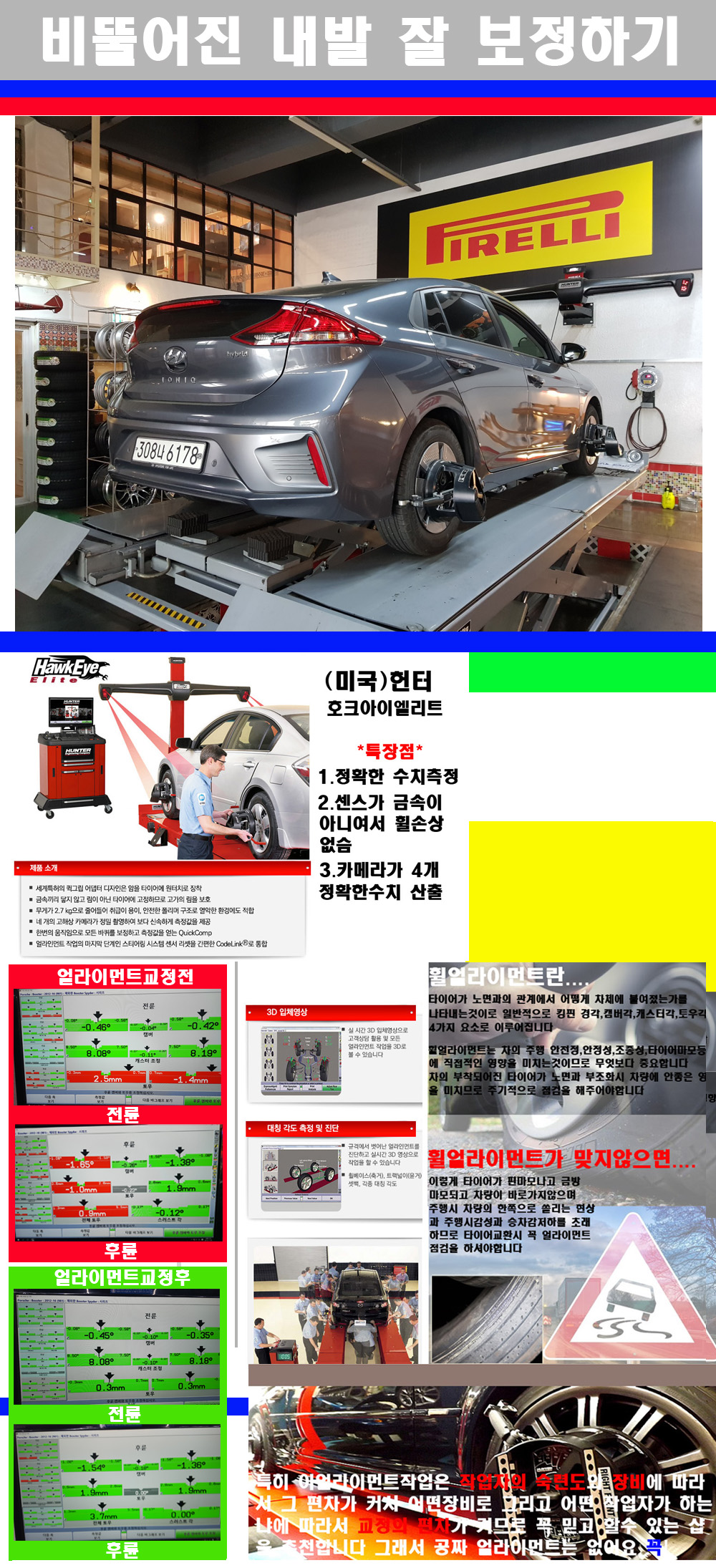 자사는 얼라이먼트정렬시 교정전 교정후를 구분하여 고객님께 직접 이수치값을 확인시켜드리고 작업을 하며 이후 각각의 특성을 가진 타이어들에 대해서 설명 및 관리요령 운전요령 같이 설명해드리고 있습니다