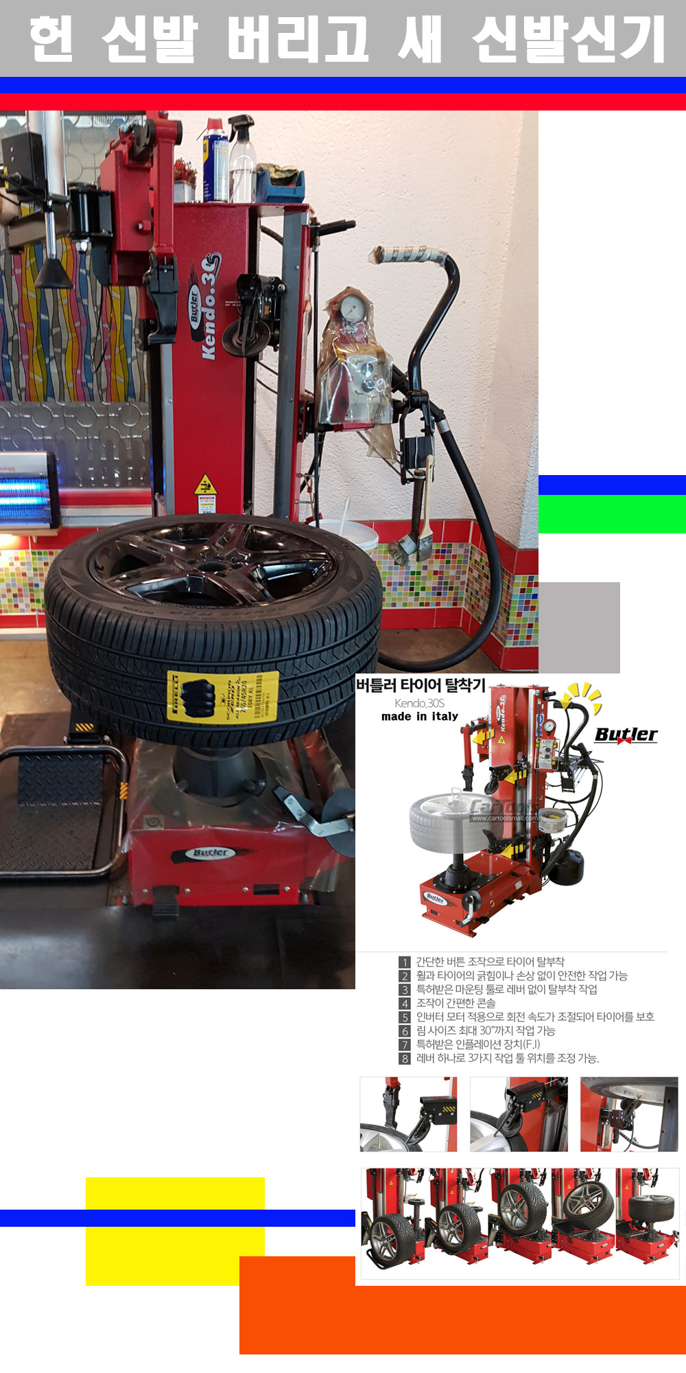 이태리 버틀러사의 켄도3.0S는 휠과 타이어와 조립과 분리시 전혀 제품에 손상을 주지않는 탈착기로 특히 센터락방식(중앙에서 휠를 고정하는 방식)이여서 휠의 중앙부위 잡아서 타이어를 탈부착하고 이후 상하롤러로 타이어를 탈부착합니다 특히 유니포미티작업(휠의 가장가벼운부분과 타이어의 가장 무거운부분을 매칭시키는 작업)시 작업자가 타이어를 정확한 지점에 휠과 매칭시킬수 있는 장점도 있습니다