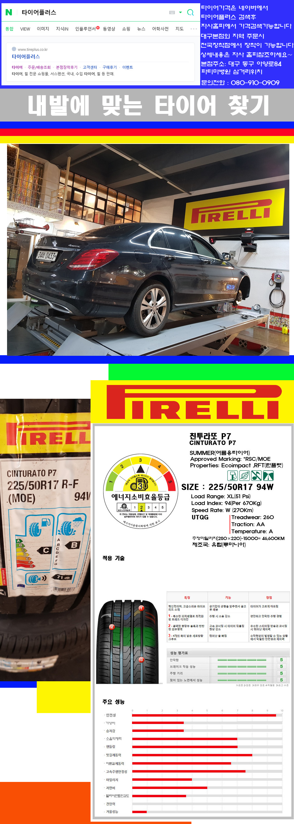 ♥♥♥본점 대구 동구 아양로84 (파티마삼거리 위치) 국산 수입타이어 할인행사중♥♥♥ 타이어플러스 대구본점은 전국에서 가장 규모가 큰매장입니다 물론 자사는 지하층 지상4층건물이며 1층작업장이외는 모두 창고로 사용중인 회사입니다 대구광역시 동구 아양로84(파티마병원 네거리에 위치) 그래서 매장으로 바로 오시면 당일에 바로 장착이 가능합니다 물론 한국 금호 넥센 브리지스톤 미쉐린 콘티넨탈 피렐리 던롭 굳이어 요코하마 등 세계유수의 10대 브랜드타이어만 취급하고 있습니다 타이어매장중 단일규모로는 아마 전국에서 제일 커지않을까 생각합니다 물론 장비도 현존하는 장비중 가장 최신장비와 그리고 유럽풍 인테리어의 최고급매장입니다 무엇하나 정품만 취급하며 작업또한 꼼꼼하게 매뉴얼에 따라서 작업을 해드립니다 특히 사장님의 이력이 화려한데 레이스로서 경험한 풍부한 자동차의 지식을 갖춘분이십니다 그래서 사장님께서 직접상담해주시고 장착도 해주시는 매장이기에 더 신뢰가 가지 않을까 생각합니다 자사는 인터넷 최저가 기반으로 성장한 회사이기에 가격또한 인터넷 최저가로 장착해 드리고 있습니다 그리고 자사는 고객만족도에서 대상까지 수상한 회사입니다 그래서 한번 저의 매장에서 작업하신 고객님은 아마 다른곳에서는 아마 눈에 차지 않을것이라 생각합니다 가격이면 가격 작업의 완성도면 완성도 그리고 사후 관리까지 최고중에 최고가 되기위해서 노력하는 매장입니다 지금까지 어느 매장에서도 느끼지 못한 감성들을 느끼시기를 바랍니다 감사합니다 저희 매장에서 많이 판매가 되는 제품입니다 BMW/벤츠 순정품타이어이며 원산지는 유럽산이며 런플랫타이어입니다 피렐리타이어 CINTURATO P7 RFT (벤츠순정품) 225/50R17 입니다 물론 벤츠C클래스 BMW320 17인치휠에 순정품으로 장착이 되는 런플랫타이어입니다 현재 재고소진을 위하여 저렴하게 판매하고 있습니다 아마 시중가 보다 많이 저렴하며 특히 자사는 이태리사의 버틀러장비와 미국 헌터사의 장비를 갖추고 보다 세밀하게 정확하게 작업을 해드리고 있습니다 이런 장비를 가지고 운영하는 매장은 대구에서도 드물것이라 생각합니다 무엇보다 수입차량 작업량이 많은 전국에서 손꼽히는 고급매장이여서 꼼꼼하게 작업을 해드리고 있습니다 고급자재와 정품타이어 그리고 휠캡하나도 순정품을 고집하는 매장입니다 고객님께서 오셔서 작업을 하시는 것을 보시고 만족도가 높은 전국최고의 매장이라 자부합니다 피렐리타이어에 대해서 생소하시죠 이회사는 전세계 시장점유율4위정도하는 프리미엄타이어를 전문적으로 생산공급하며 주로 신차용 순정품타이어(벤츠 BMW 아우디 포르쉐 폭스바겐등)를 공급하는 고급타이어를 위주로 생산하는 회사입니다 타이어업계에서 상품의 우수성과 브랜드 밸류가 가장 높은 회사가 아닐까 생각이됩니다 그리고 제품이 많이 고급지다라고 말씀해 드리고 싶습니다 하지만 이런 상품도 작업자의 작업과정과 장비에 따라서 많이 차이가 나기에 싸고 작업잘하고 고급진곳이 아마 타이어플러스가 아닐까 생각합니다 전국 최대 매장 고급매장 최신설비가 완비된 곳입니다 감사합니다
