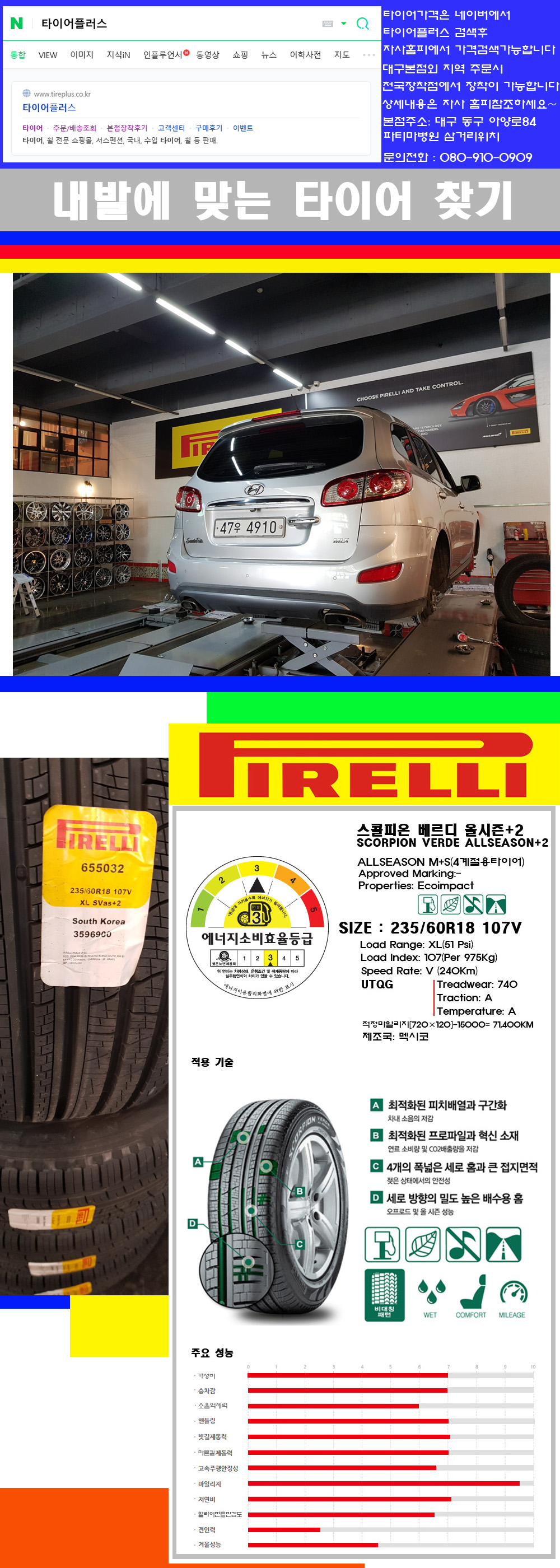 ♥♥♥본점 대구 동구 아양로84 (파티마삼거리 위치) 국산 수입타이어 할인행사중♥♥♥ 타이어플러스 대구본점은 전국에서 가장 규모가 큰매장입니다 물론 자사는 지하층 지상4층건물이며 1층작업장이외는 모두 창고로 사용중인 회사입니다 대구광역시 동구 아양로84(파티마병원 네거리에 위치) 그래서 매장으로 바로 오시면 당일에 바로 장착이 가능합니다 물론 한국 금호 넥센 브리지스톤 미쉐린 콘티넨탈 피렐리 던롭 굳이어 요코하마 등 세계유수의 10대 브랜드타이어만 취급하고 있습니다 타이어매장중 단일규모로는 아마 전국에서 제일 커지않을까 생각합니다 물론 장비도 현존하는 장비중 가장 최신장비와 그리고 유럽풍 인테리어의 최고급매장입니다 무엇하나 정품만 취급하며 작업또한 꼼꼼하게 매뉴얼에 따라서 작업을 해드립니다 특히 사장님의 이력이 화려한데 레이스로서 경험한 풍부한 자동차의 지식을 갖춘분이십니다 그래서 사장님께서 직접상담해주시고 장착도 해주시는 매장이기에 더 신뢰가 가지 않을까 생각합니다 자사는 인터넷 최저가 기반으로 성장한 회사이기에 가격또한 인터넷 최저가로 장착해 드리고 있습니다 그리고 자사는 고객만족도에서 대상까지 수상한 회사입니다 그래서 한번 저의 매장에서 작업하신 고객님은 아마 다른곳에서는 아마 눈에 차지 않을것이라 생각합니다 가격이면 가격 작업의 완성도면 완성도 그리고 사후 관리까지 최고중에 최고가 되기위해서 노력하는 매장입니다 지금까지 어느 매장에서도 느끼지 못한 감성들을 느끼시기를 바랍니다 감사합니다 요즘 SUV전용타이어 많이 시판되고 있습니다 회사별로도 무수한 패턴들이 생산이 되고있습니다 대충 타이어의 성격들을 보면 이러합니다