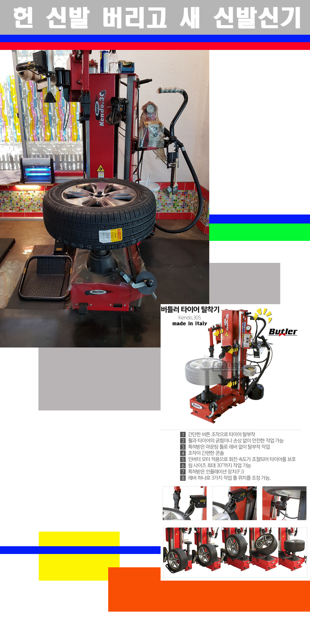 이태리 버틀러사의 켄도3.0S는 휠과 타이어와 조립과 분리시 전혀 제품에 손상을 주지않는 탈착기로 특히 센터락방식(중앙에서 휠를 고정하는 방식)이여서 휠의 중앙부위 잡아서 타이어를 탈부착하고 이후 상하롤러로 타이어를 탈부착합니다 특히 유니포미티작업(휠의 가장가벼운부분과 타이어의 가장 무거운부분을 매칭시키는 작업)시 작업자가 타이어를 정확한 지점에 휠과 매칭시킬수 있는 장점도 있습니다