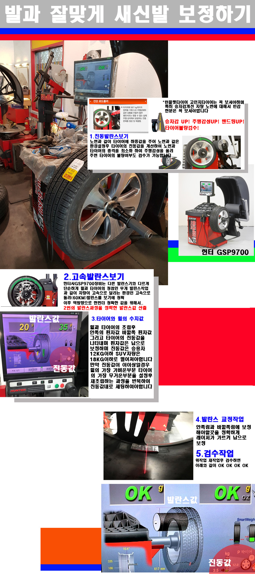그리고 작업자에게는 불필요한 발란스납을 붙이지 않아 미관상으로 좋고 납을 절약하는 고객님에게도윈이고 작업자에게도 윈윈할수 있는 장비입니다 그리고 시중에서 고속진동발란스라고 말하시는 샵들이 많은데 꼭아셔야하는것은 고속발란스는 말그대로 발란스를 볼때 고속으로 돌리기에 60키로 전후 그리고 진동값을 계산하기위해서는 발란스기에 진동롤러가 있어야합니다 그래서 미국헌터사 GSP9700장비가 유일합니다 다른 샵에서 말하는 발란스기는 고속진동발란스기능없는 일반발란스 기기입니다 이점 꼭 아시고 장착하시기를 바랍니다