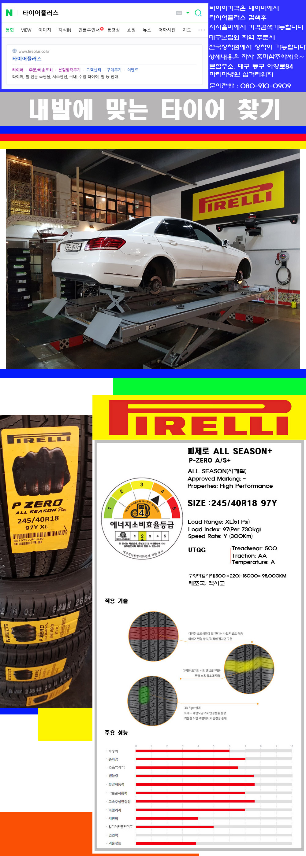 ♥♥♥본점 대구 동구 아양로84 (파티마삼거리 위치) 국산 수입타이어 할인행사중♥♥♥ 타이어플러스 대구본점은 전국에서 가장 규모가 큰매장입니다 물론 자사는 지하층 지상4층건물이며 1층작업장이외는 모두 창고로 사용중인 회사입니다 대구광역시 동구 아양로84(파티마병원 네거리에 위치) 그래서 매장으로 바로 오시면 당일에 바로 장착이 가능합니다 물론 한국 금호 넥센 브리지스톤 미쉐린 콘티넨탈 피렐리 던롭 굳이어 요코하마 등 세계유수의 10대 브랜드타이어만 취급하고 있습니다 타이어매장중 단일규모로는 아마 전국에서 제일 커지않을까 생각합니다 물론 장비도 현존하는 장비중 가장 최신장비와 그리고 유럽풍 인테리어의 최고급매장입니다 무엇하나 정품만 취급하며 작업또한 꼼꼼하게 매뉴얼에 따라서 작업을 해드립니다 특히 사장님의 이력이 화려한데 레이스로서 경험한 풍부한 자동차의 지식을 갖춘분이십니다 그래서 사장님께서 직접상담해주시고 장착도 해주시는 매장이기에 더 신뢰가 가지 않을까 생각합니다 자사는 인터넷 최저가 기반으로 성장한 회사이기에 가격또한 인터넷 최저가로 장착해 드리고 있습니다 그리고 자사는 고객만족도에서 대상까지 수상한 회사입니다 그래서 한번 저의 매장에서 작업하신 고객님은 아마 다른곳에서는 아마 눈에 차지 않을것이라 생각합니다 가격이면 가격 작업의 완성도면 완성도 그리고 사후 관리까지 최고중에 최고가 되기위해서 노력하는 매장입니다 지금까지 어느 매장에서도 느끼지 못한 감성들을 느끼시기를 바랍니다 감사합니다 피렐리타이어에 대해서 생소하시죠 이회사는 전세계 시장점유율4위정도하는 프리미엄타이어를 전문적으로 생산공급하며 주로 신차용 순정품타이어를 공급하는 고급타이어를 위주로 생산하는 회사입니다 참고로 승용차용 패턴은 피제로타이어와 P7타이어가 있습니다 물론 여름용타이어입니다 그리고 이여름용타이어는 100%가 수입차량의 순정품타이어로 장착됩니다 여름용타이어는 여름에만 사용하는 것이 아니라 영상7도씨에서 최상의 성능을 발휘하기에 이렇게 불려지는것입니다 그리고 타이어성상에 따라서 런플랫타이어와 일반타이어 스폰지타이어 씰타이어이렇게 공급이 되며 그리고 이후 RE용시장용으로 올시즌타이어가 공급이 되고 있습니다 그리고 위의 제품의 원산지는 멕시코이며 사계절용타이어이지만 소음억제력과 특히 승차감과 차량의 퍼포먼스능력을 극대화 시켜놓은 타이어입니다 아마 현존하는 사계절용타이어중 퍼포먼스능력이 제일 좋은 제품이 아닐까 생각합니다 이미 이회사의 상품에대한 우수성이나 신뢰도는 언급을 하지 않으셔도 어느정도의 제품밸류를 가진 회사인것도 아실것 같습니다 고급타이어를 선호하시는 고객님께 추천하는 브랜드입니다 제품의 우수성과 밸류그리고 성능까지 갖춘 제품들로 라인업이 되어져 있는 브랜드입니다 감사합니다