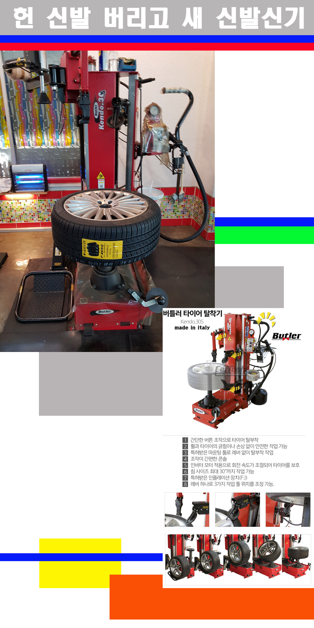 이태리 버틀러사의 켄도3.0S는 휠과 타이어와 조립과 분리시 전혀 제품에 손상을 주지않는 탈착기로 특히 센터락방식(중앙에서 휠를 고정하는 방식)이여서 휠의 중앙부위 잡아서 타이어를 탈부착하고 이후 상하롤러로 타이어를 탈부착합니다 특히 유니포미티작업(휠의 가장가벼운부분과 타이어의 가장 무거운부분을 매칭시키는 작업)시 작업자가 타이어를 정확한 지점에 휠과 매칭시킬수 있는 장점도 있습니다