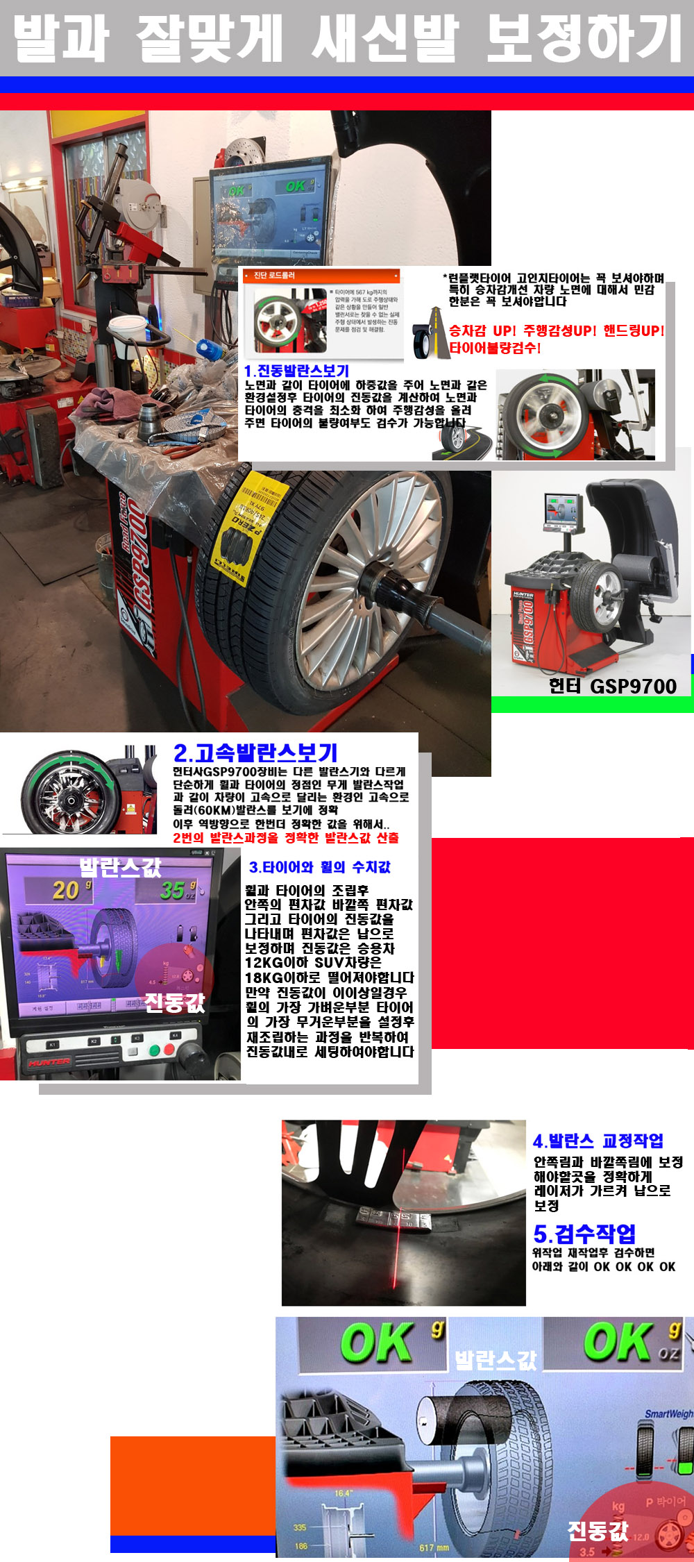 그리고 작업자에게는 불필요한 발란스납을 붙이지 않아 미관상으로 좋고 납을 절약하는 고객님에게도윈이고 작업자에게도 윈윈할수 있는 장비입니다 그리고 시중에서 고속진동발란스라고 말하시는 샵들이 많은데 꼭아셔야하는것은 고속발란스는 말그대로 발란스를 볼때 고속으로 돌리기에 60키로 전후 그리고 진동값을 계산하기위해서는 발란스기에 진동롤러가 있어야합니다 그래서 미국헌터사 GSP9700장비가 유일합니다 다른 샵에서 말하는 발란스기는 고속진동발란스기능없는 일반발란스 기기입니다 이점 꼭 아시고 장착하시기를 바랍니다