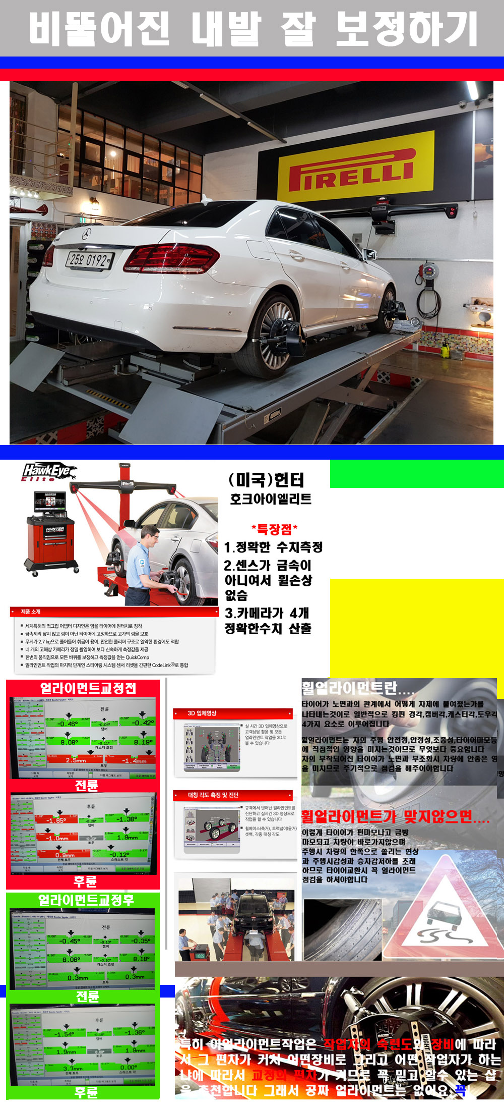 자사는 얼라이먼트정렬시 교정전 교정후를 구분하여 고객님께 직접 이수치값을 확인시켜드리고 작업을 하며 이후 각각의 특성을 가진 타이어들에 대해서 설명 및 관리요령 운전요령 같이 설명해드리고 있습니다