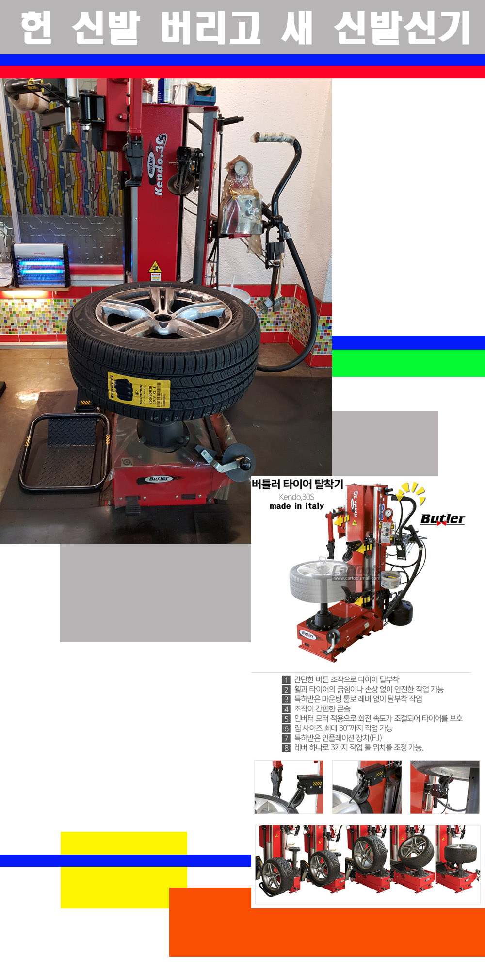 이태리 버틀러사의 켄도3.0S는 휠과 타이어와 조립과 분리시 전혀 제품에 손상을 주지않는 탈착기로 특히 센터락방식(중앙에서 휠를 고정하는 방식)이여서 휠의 중앙부위 잡아서 타이어를 탈부착하고 이후 상하롤러로 타이어를 탈부착합니다 특히 유니포미티작업(휠의 가장가벼운부분과 타이어의 가장 무거운부분을 매칭시키는 작업)시 작업자가 타이어를 정확한 지점에 휠과 매칭시킬수 있는 장점도 있습니다