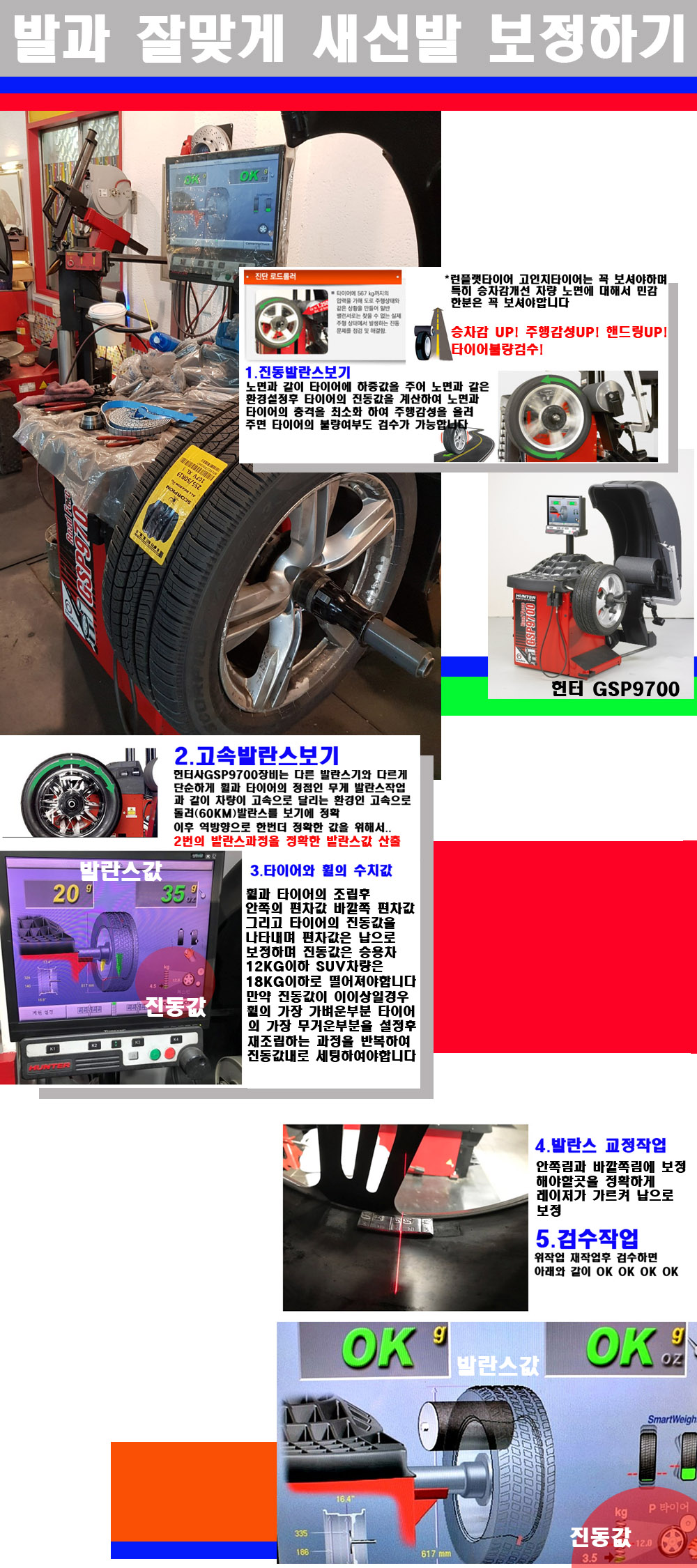 그리고 작업자에게는 불필요한 발란스납을 붙이지 않아 미관상으로 좋고 납을 절약하는 고객님에게도윈이고 작업자에게도 윈윈할수 있는 장비입니다 그리고 시중에서 고속진동발란스라고 말하시는 샵들이 많은데 꼭아셔야하는것은 고속발란스는 말그대로 발란스를 볼때 고속으로 돌리기에 60키로 전후 그리고 진동값을 계산하기위해서는 발란스기에 진동롤러가 있어야합니다 그래서 미국헌터사 GSP9700장비가 유일합니다 다른 샵에서 말하는 발란스기는 고속진동발란스기능없는 일반발란스 기기입니다 이점 꼭 아시고 장착하시기를 바랍니다