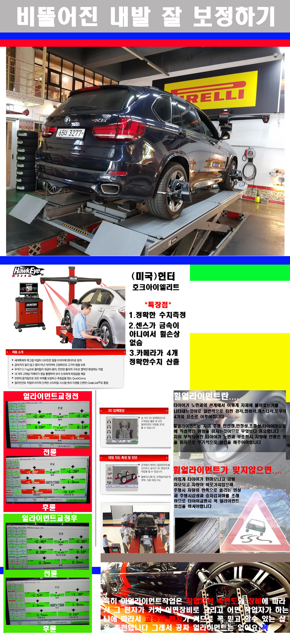 자사는 얼라이먼트정렬시 교정전 교정후를 구분하여 고객님께 직접 이수치값을 확인시켜드리고 작업을 하며 이후 각각의 특성을 가진 타이어들에 대해서 설명 및 관리요령 운전요령 같이 설명해드리고 있습니다