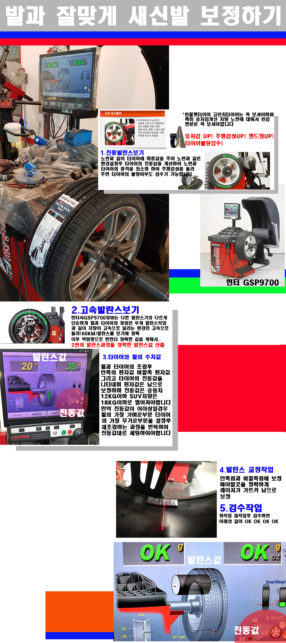 그리고 작업자에게는 불필요한 발란스납을 붙이지 않아 미관상으로 좋고 납을 절약하는 고객님에게도윈이고 작업자에게도 윈윈할수 있는 장비입니다 그리고 시중에서 고속진동발란스라고 말하시는 샵들이 많은데 꼭아셔야하는것은 고속발란스는 말그대로 발란스를 볼때 고속으로 돌리기에 60키로 전후 그리고 진동값을 계산하기위해서는 발란스기에 진동롤러가 있어야합니다 그래서 미국헌터사 GSP9700장비가 유일합니다 다른 샵에서 말하는 발란스기는 고속진동발란스기능없는 일반발란스 기기입니다 이점 꼭 아시고 장착하시기를 바랍니다