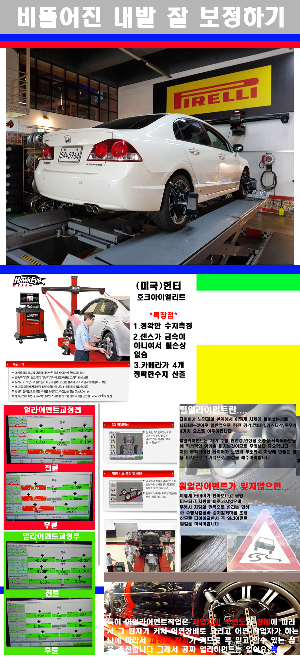 자사는 얼라이먼트정렬시 교정전 교정후를 구분하여 고객님께 직접 이수치값을 확인시켜드리고 작업을 하며 이후 각각의 특성을 가진 타이어들에 대해서 설명 및 관리요령 운전요령 같이 설명해드리고 있습니다