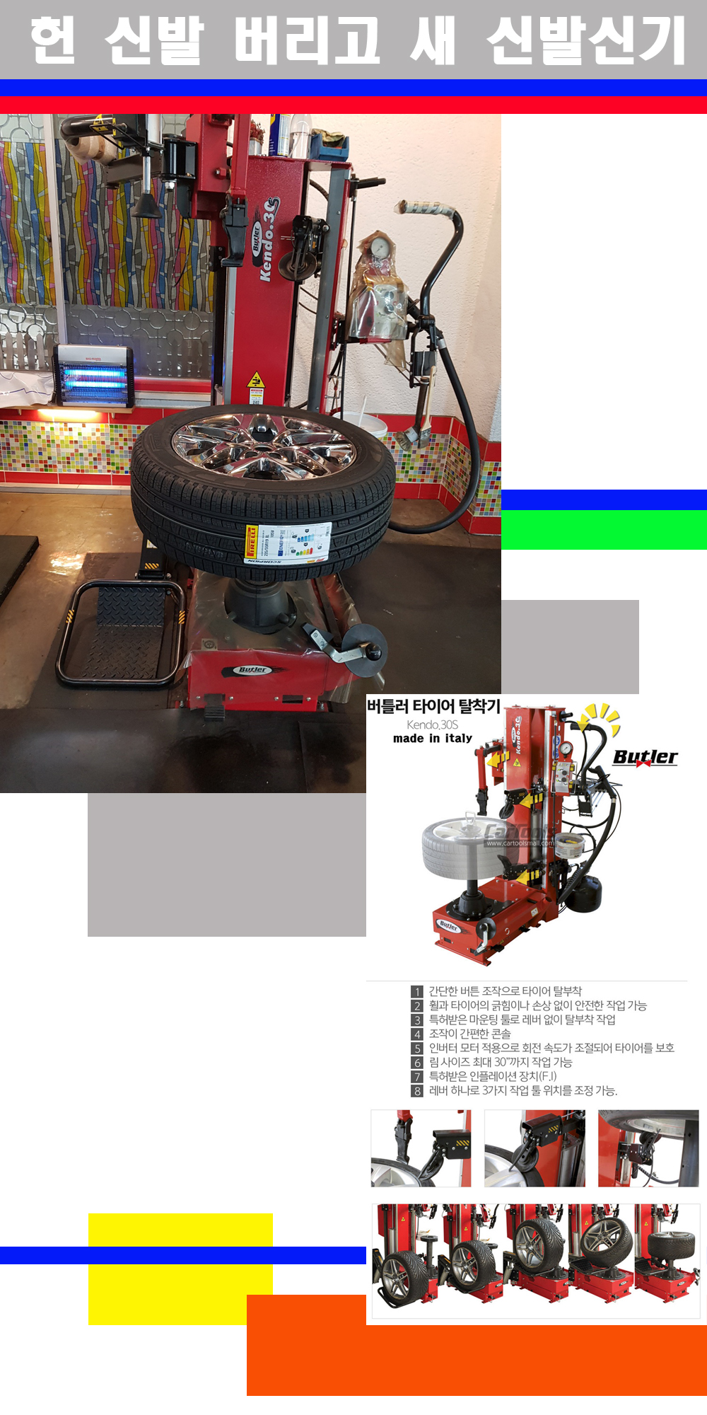이태리 버틀러사의 켄도3.0S는 휠과 타이어와 조립과 분리시 전혀 제품에 손상을 주지않는 탈착기로 특히 센터락방식(중앙에서 휠를 고정하는 방식)이여서 휠의 중앙부위 잡아서 타이어를 탈부착하고 이후 상하롤러로 타이어를 탈부착합니다 특히 유니포미티작업(휠의 가장가벼운부분과 타이어의 가장 무거운부분을 매칭시키는 작업)시 작업자가 타이어를 정확한 지점에 휠과 매칭시킬수 있는 장점도 있습니다