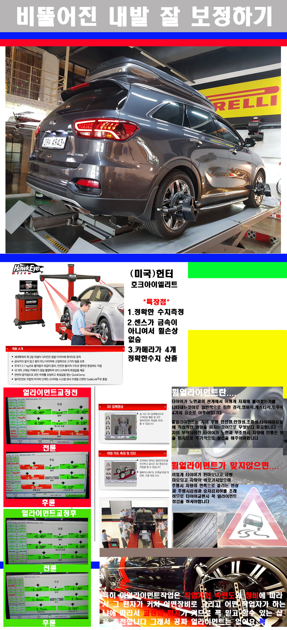 자사는 얼라이먼트정렬시 교정전 교정후를 구분하여 고객님께 직접 이수치값을 확인시켜드리고 작업을 하며 이후 각각의 특성을 가진 타이어들에 대해서 설명 및 관리요령 운전요령 같이 설명해드리고 있습니다