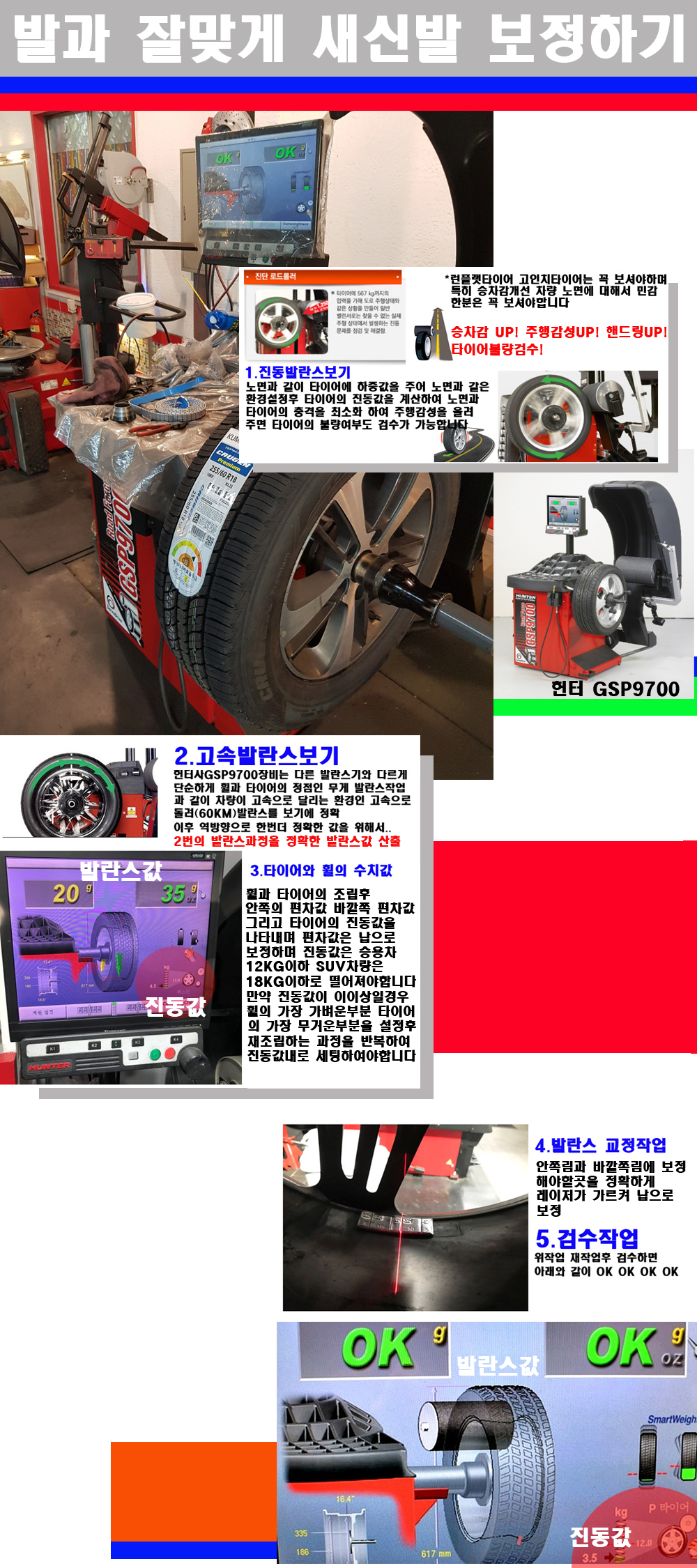 그리고 작업자에게는 불필요한 발란스납을 붙이지 않아 미관상으로 좋고 납을 절약하는 고객님에게도윈이고 작업자에게도 윈윈할수 있는 장비입니다 그리고 시중에서 고속진동발란스라고 말하시는 샵들이 많은데 꼭아셔야하는것은 고속발란스는 말그대로 발란스를 볼때 고속으로 돌리기에 60키로 전후 그리고 진동값을 계산하기위해서는 발란스기에 진동롤러가 있어야합니다 그래서 미국헌터사 GSP9700장비가 유일합니다 다른 샵에서 말하는 발란스기는 고속진동발란스기능없는 일반발란스 기기입니다 이점 꼭 아시고 장착하시기를 바랍니다