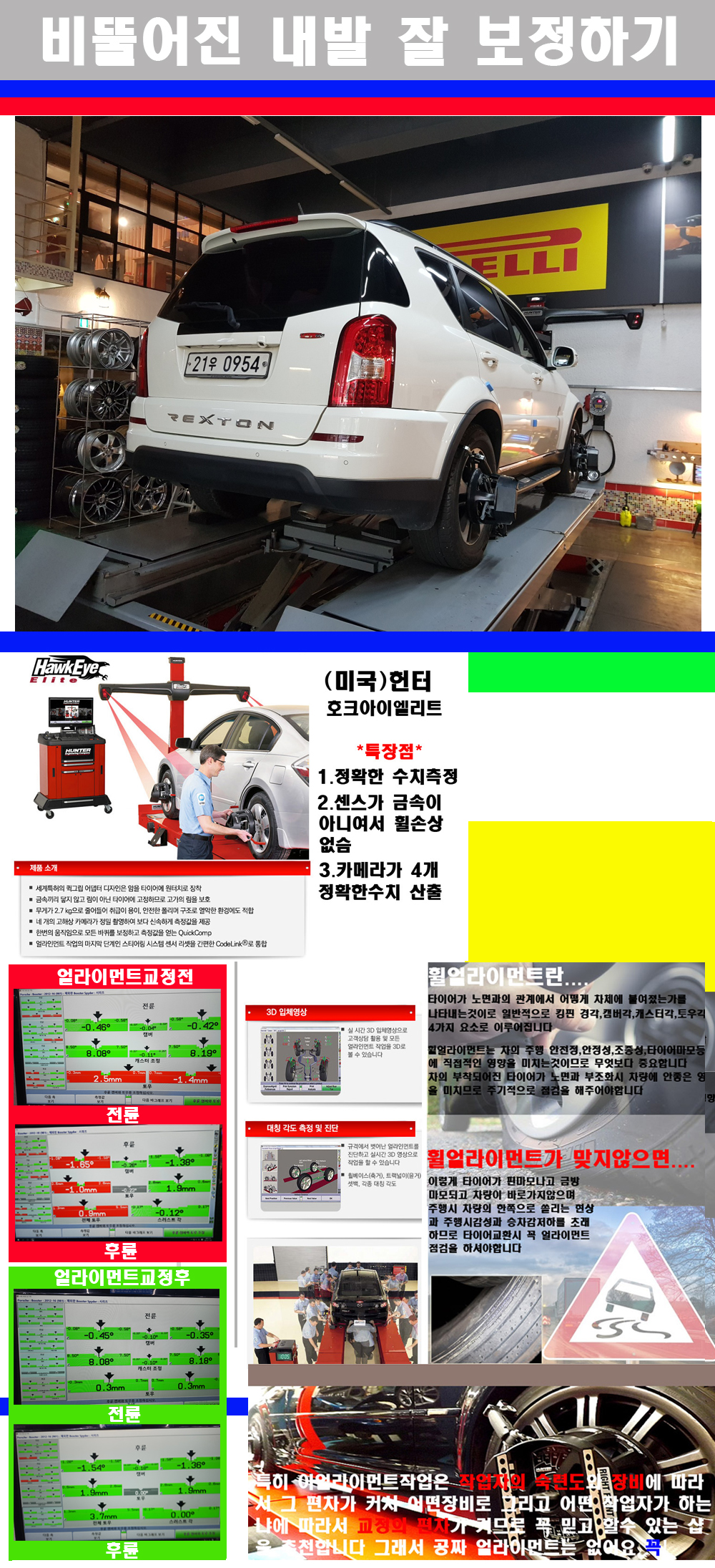 자사는 얼라이먼트정렬시 교정전 교정후를 구분하여 고객님께 직접 이수치값을 확인시켜드리고 작업을 하며 이후 각각의 특성을 가진 타이어들에 대해서 설명 및 관리요령 운전요령 같이 설명해드리고 있습니다