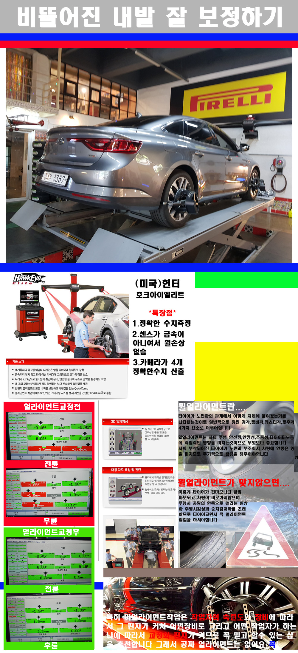 자사는 얼라이먼트정렬시 교정전 교정후를 구분하여 고객님께 직접 이수치값을 확인시켜드리고 작업을 하며 이후 각각의 특성을 가진 타이어들에 대해서 설명 및 관리요령 운전요령 같이 설명해드리고 있습니다