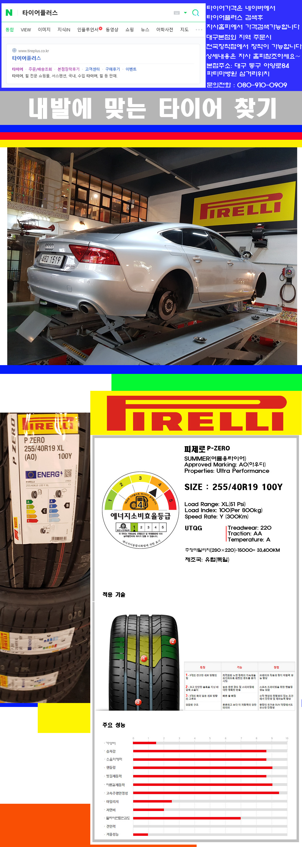 ♥♥♥본점 대구 동구 아양로84 (파티마삼거리 위치) 국산 수입타이어 할인행사중♥♥♥ 타이어플러스 대구본점은 전국에서 가장 규모가 큰매장입니다 물론 자사는 지하층 지상4층건물이며 1층작업장이외는 모두 창고로 사용중인 회사입니다 대구광역시 동구 아양로84(파티마병원 네거리에 위치) 그래서 매장으로 바로 오시면 당일에 바로 장착이 가능합니다 물론 한국 금호 넥센 브리지스톤 미쉐린 콘티넨탈 피렐리 던롭 굳이어 요코하마 등 세계유수의 10대 브랜드타이어만 취급하고 있습니다 타이어매장중 단일규모로는 아마 전국에서 제일 커지않을까 생각합니다 물론 장비도 현존하는 장비중 가장 최신장비와 그리고 유럽풍 인테리어의 최고급매장입니다 무엇하나 정품만 취급하며 작업또한 꼼꼼하게 매뉴얼에 따라서 작업을 해드립니다 특히 사장님의 이력이 화려한데 레이스로서 경험한 풍부한 자동차의 지식을 갖춘분이십니다 그래서 사장님께서 직접상담해주시고 장착도 해주시는 매장이기에 더 신뢰가 가지 않을까 생각합니다 자사는 인터넷 최저가 기반으로 성장한 회사이기에 가격또한 인터넷 최저가로 장착해 드리고 있습니다 그리고 자사는 고객만족도에서 대상까지 수상한 회사입니다 그래서 한번 저의 매장에서 작업하신 고객님은 아마 다른곳에서는 아마 눈에 차지 않을것이라 생각합니다 가격이면 가격 작업의 원성도면 원성도 그리고 사후 관리까지 최고중에 최고가 되기위해서 노력하는 매장입니다 지금까지 어느 매장에서도 느끼지 못한 감성들을 느끼시기를 바랍니다 감사합니다 피렐리타이어에 대해서 생소하시죠 이회사는 전세계 시장점유율4위정도하는 프리미엄타이어를 전문적으로 생산공급하며 주로 신차용 순정품타이어를 공급하는 고급타이어를 위주로 생산하는 회사입니다 참고로 승용차용 패턴은 피제로타이어와 P7타이어가 있습니다 물론 여름용타이어입니다 그리고 이여름용타이어는 100%가 수입차량의 순정품타이어로 장착됩니다 여름용타이어라고 해서 여름에만 사용하는 제품이아니라 기온에 따라서 상온에서 성능을 극대화시킨 타이어라고 생각하시면됩니다 보통 4계절용타이어보다 잘서고 잘돌고 잘달립니다 물론 배수성능도 4계절용타이어보다 30%이상 됩니다 그래서 마모도가 빠른 것이 단점이지만 소리가 없어 정숙하고 승차감또한 4계절용타이어보다 월등합니다 그래서 수입차량에는 이고가 제품인 여름용타이어가 순정으로 장착되어져 나오고 있습니다 거의 대부분의 수입차량에 이 여름용타이어가 장착된다 생각하시면 무관합니다 단지 4계절용타이어는 내마모성이 우수하고 그리고 결빙된 노면에서 제동거리가 조금 짧다는 것이 장점이며 본연의 타이어성능은 모든면에서 여름용타이어가 월등합니다 그리고 타이어성상에 따라서 런플랫타이어와 일반타이어 스폰지타이어 씰타이어이렇게 공급이 되며 그리고 이후 RE용시장용으로 올시즌타이어가 공급이 되고 있습니다 아마 피렐리타이어 피제로라는 제품은 현존하는 타이어중가장 퍼포먼스능력이 제일 좋은 제품이 아닐까 생각합니다 이미 이회사의 상품에대한 우수성이나 신뢰도는 언급을 하지 않으셔도 어느정도의 제품밸류를 가진 회사인것도 아실것 같습니다 피렐리타이어는 고급타이어를 선호하시는 고객님께 추천하는 브랜드입니다 제품의 우수성과 밸류그리고 성능까지 갖춘 제품들로 라인업이 되어져 있는 브랜드입니다 그리고 수입차량에 따라서 브랜드별로 같은 사이즈여도 위의 타이어의 속성에 따라서 구분되어져 공급이 되어지는 제품들이여서 꼭 순정품타이어를 권장합니다 감사합니다