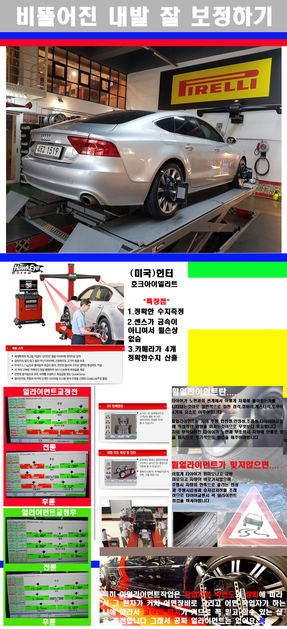 자사는 얼라이먼트정렬시 교정전 교정후를 구분하여 고객님께 직접 이수치값을 확인시켜드리고 작업을 하며 이후 각각의 특성을 가진 타이어들에 대해서 설명 및 관리요령 운전요령 같이 설명해드리고 있습니다