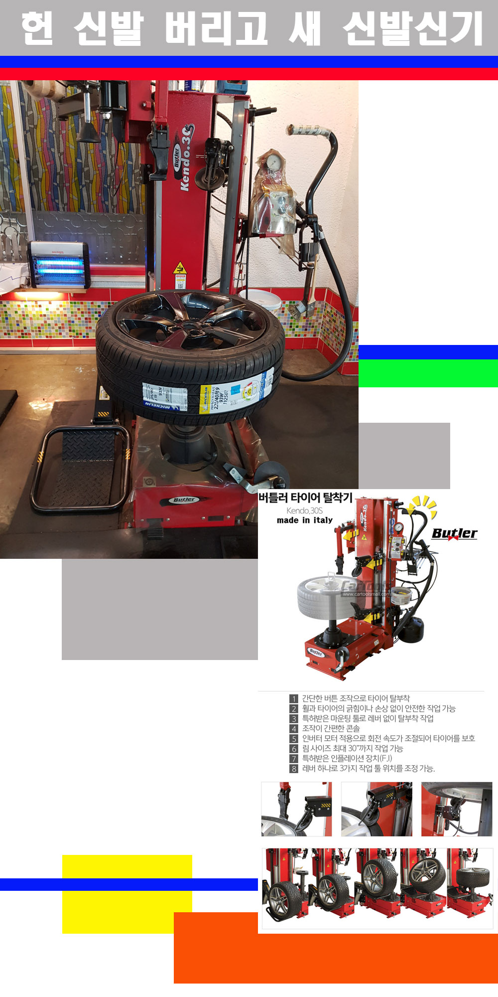 이태리 버틀러사의 켄도3.0S는 휠과 타이어와 조립과 분리시 전혀 제품에 손상을 주지않는 탈착기로 특히 센터락방식(중앙에서 휠를 고정하는 방식)이여서 휠의 중앙부위 잡아서 타이어를 탈부착하고 이후 상하롤러로 타이어를 탈부착합니다 특히 유니포미티작업(휠의 가장가벼운부분과 타이어의 가장 무거운부분을 매칭시키는 작업)시 작업자가 타이어를 정확한 지점에 휠과 매칭시킬수 있는 장점도 있습니다