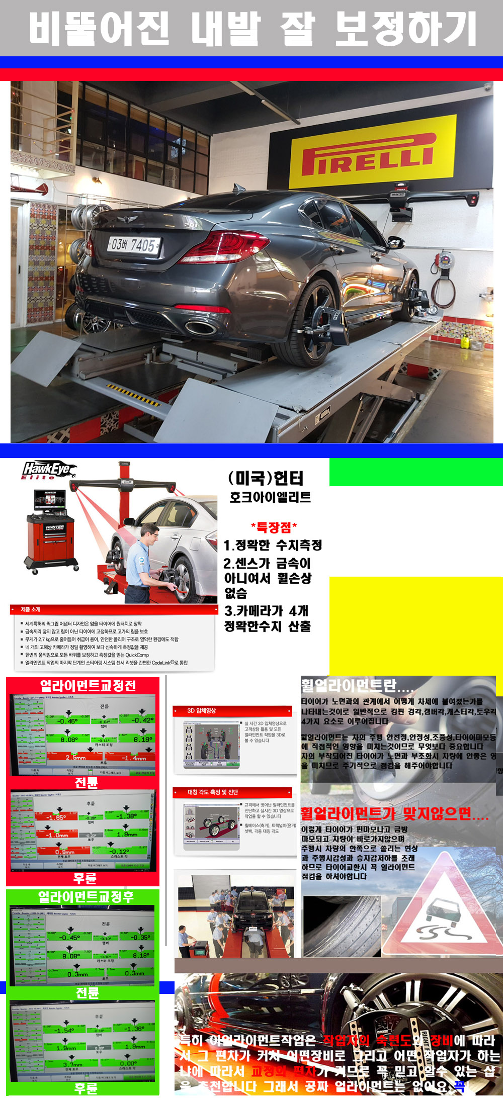 자사는 얼라이먼트정렬시 교정전 교정후를 구분하여 고객님께 직접 이수치값을 확인시켜드리고 작업을 하며 이후 각각의 특성을 가진 타이어들에 대해서 설명 및 관리요령 운전요령 같이 설명해드리고 있습니다