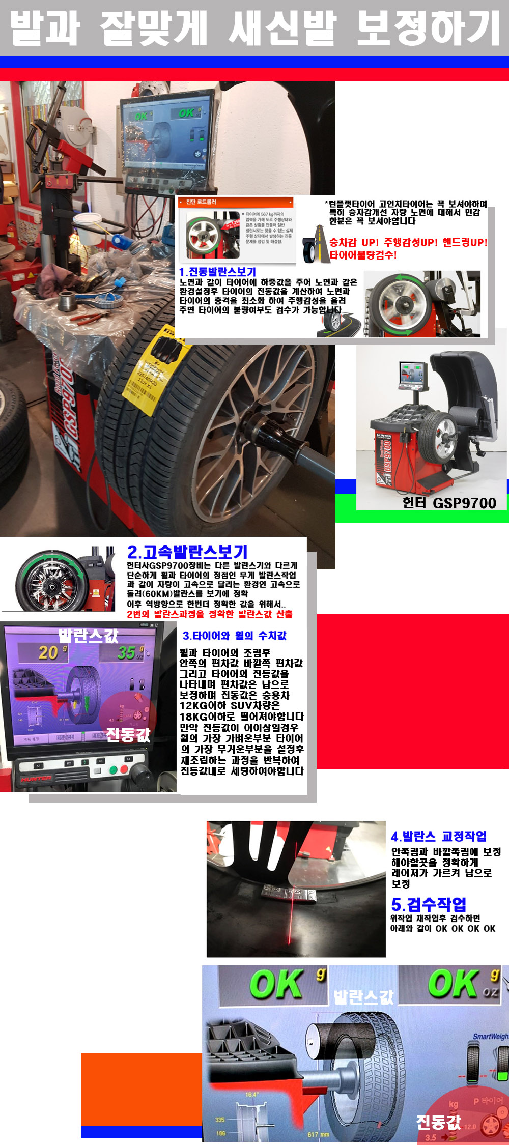 그리고 작업자에게는 불필요한 발란스납을 붙이지 않아 미관상으로 좋고 납을 절약하는 고객님에게도윈이고 작업자에게도 윈윈할수 있는 장비입니다 그리고 시중에서 고속진동발란스라고 말하시는 샵들이 많은데 꼭아셔야하는것은 고속발란스는 말그대로 발란스를 볼때 고속으로 돌리기에 60키로 전후 그리고 진동값을 계산하기위해서는 발란스기에 진동롤러가 있어야합니다 그래서 미국헌터사 GSP9700장비가 유일합니다 다른 샵에서 말하는 발란스기는 고속진동발란스기능없는 일반발란스 기기입니다 이점 꼭 아시고 장착하시기를 바랍니다