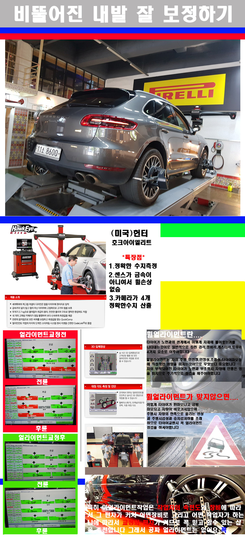 자사는 얼라이먼트정렬시 교정전 교정후를 구분하여 고객님께 직접 이수치값을 확인시켜드리고 작업을 하며 이후 각각의 특성을 가진 타이어들에 대해서 설명 및 관리요령 운전요령 같이 설명해드리고 있습니다