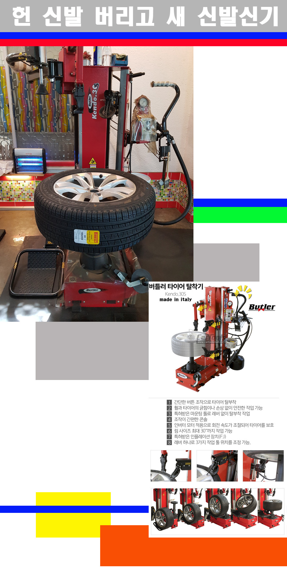 이태리 버틀러사의 켄도3.0S는 휠과 타이어와 조립과 분리시 전혀 제품에 손상을 주지않는 탈착기로 특히 센터락방식(중앙에서 휠를 고정하는 방식)이여서 휠의 중앙부위 잡아서 타이어를 탈부착하고 이후 상하롤러로 타이어를 탈부착합니다 특히 유니포미티작업(휠의 가장가벼운부분과 타이어의 가장 무거운부분을 매칭시키는 작업)시 작업자가 타이어를 정확한 지점에 휠과 매칭시킬수 있는 장점도 있습니다