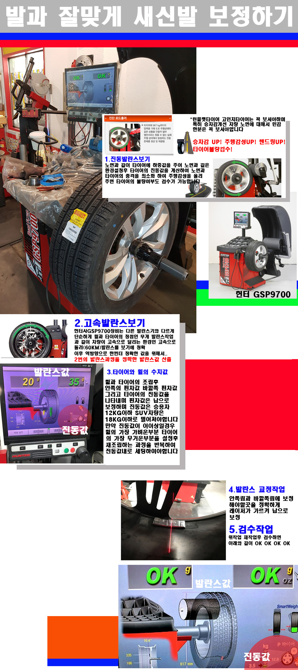 그리고 작업자에게는 불필요한 발란스납을 붙이지 않아 미관상으로 좋고 납을 절약하는 고객님에게도윈이고 작업자에게도 윈윈할수 있는 장비입니다 그리고 시중에서 고속진동발란스라고 말하시는 샵들이 많은데 꼭아셔야하는것은 고속발란스는 말그대로 발란스를 볼때 고속으로 돌리기에 60키로 전후 그리고 진동값을 계산하기위해서는 발란스기에 진동롤러가 있어야합니다 그래서 미국헌터사 GSP9700장비가 유일합니다 다른 샵에서 말하는 발란스기는 고속진동발란스기능없는 일반발란스 기기입니다 이점 꼭 아시고 장착하시기를 바랍니다